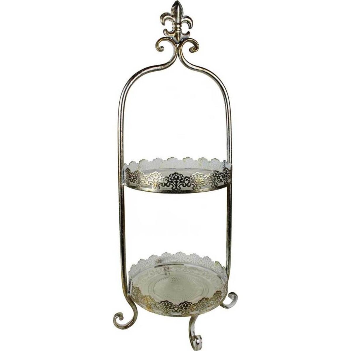 The 79 cm tall tiered stand would look perfect for serving festive delicacies or for making any celebratory meal look even more fabulous. The tiered stand has two round shelves that have a gorgeous metal filigree border that is ornate and very vintage in its appeal. The top has a typical fleur de lis pattern that makes its design seem all the more classic.