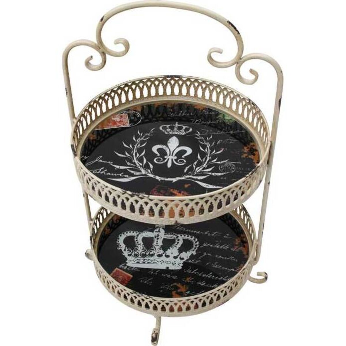 The product Tiered Stand Creme Wreath comprises of a stand with two tiers. It features metallic construction for the framework, with glass being utilized for the storage surfaces. The glass exhibits attractive artwork, with the stand having wheels at the bottom to facilitate its easy relocation. Tiered Stand Creme Wreath has measurements of 31x31x54 cm and weighs 3.22kg, overall. The length by width by height measurements of the framework are 35x31x58 cm. This product may be utilized within the kitchen for keeping groceries which are ready for immediate use. One might opt to position it at a strategic corner within the living room to accentuate its outlook.