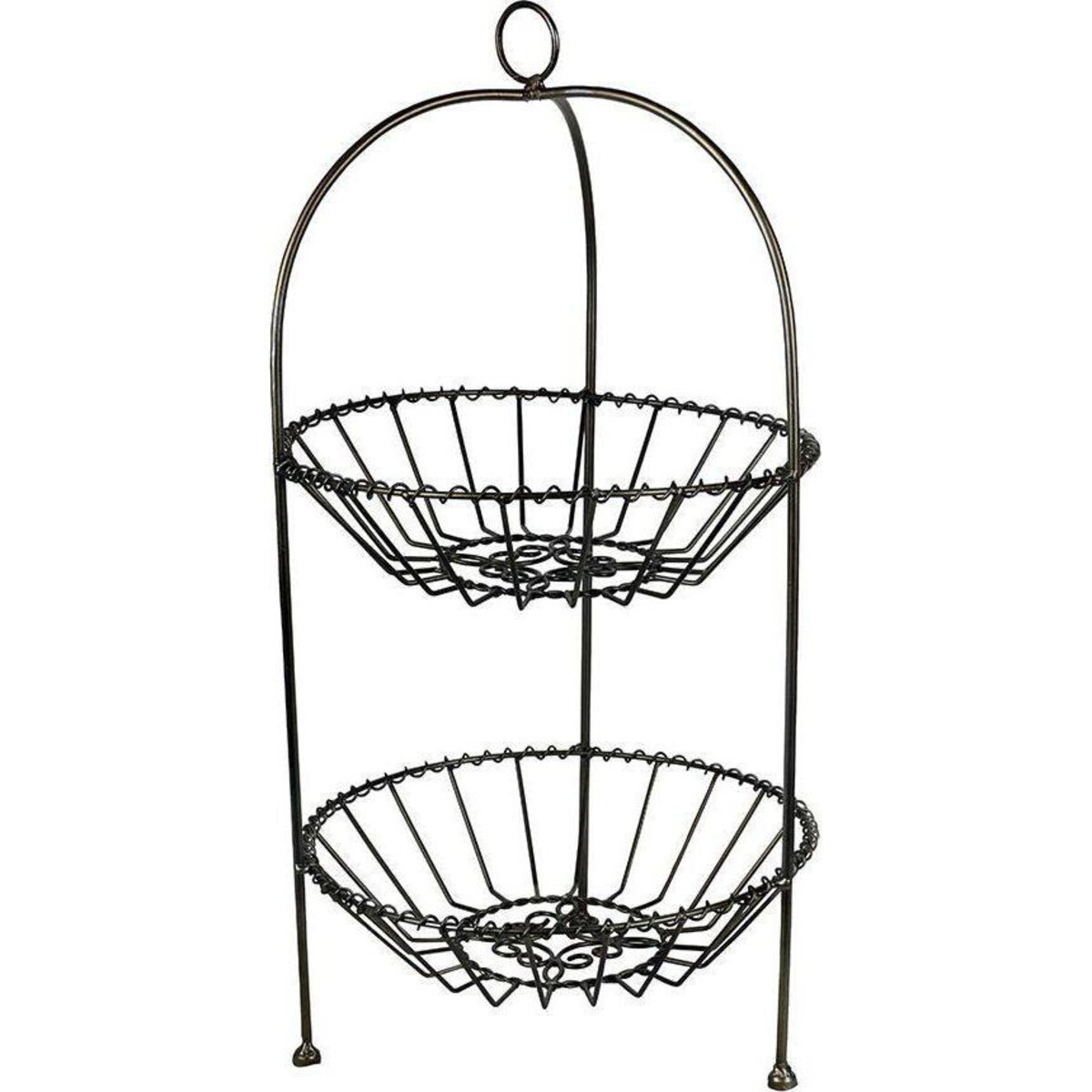 Made from metal wire and given the right finish in terms of its colour and the neat roundness of its wired structure - this tow tiered stand will work wonders to help you display fruits that you wish to serve or display - or when you want your fresh breads and rolls to be made to look attractively offered to guests. With a height of almost 53 cm, it could make space as an additional end table and help keep things more organized on the main table. Use it also for stacking used plates or for keeping fresh plates if you so desire ?there are numerous ways n which t ca make itself useful. The tripod legged frame with its rounded lags will leave no scratches on any surface, while it round small handle on top will make picking and placing this stand a complete breeze. The round mesh baskets have a diameter of 27 cm making it an adequately large space for stacking a number of things. A lovely décor accessory that works wonders as an organizer and has sturdy metal features to see you through years of usage.