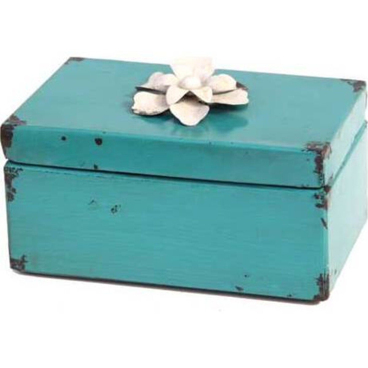 The tin boxes feature a vibrant blue hue that's accented with scuffs around the corners and edges to give them a antique and well - loved feel. At the top sits a single white flower, the perfect finishing touch to a lovely decorative accent. Although there's plenty of room inside to store a variety of items, the boxes aren't so big that they're cumbersome or take up a lot of space. Place them on end tables, mantles, kitchen counters, dressers, or even bathroom counters and they'll quickly become the new favourite pieces to add a touch of elegant beauty anywhere it's desired.