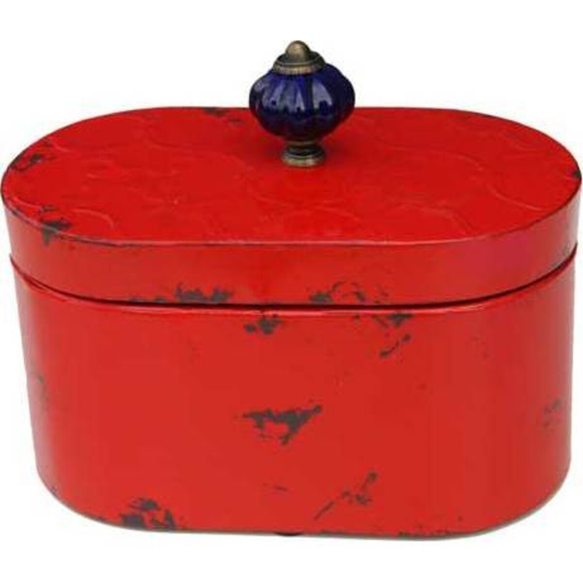 Simply scintillating as far as the colour of this tin box is concerned-it can liven up any part of the house with its one of a kind brilliant colour pop. The tin with its chic oriental design has chipped paint which adds more spunk to its look. The oblong shape gives it more of a unique storage nook as it can easily accommodate many small trinkets, even precious jewelry and collectibles .A hard to resist pick for those who like to store tings not in non descript little boxes that need to be hidden, but in boxes and tins with a character of their own to make them stand out with their distinct look. A lovely addition to a dull desk, or even the coffee table where one could use it to store some exotic flavored tea bags or spices that you would want to use from time to time.