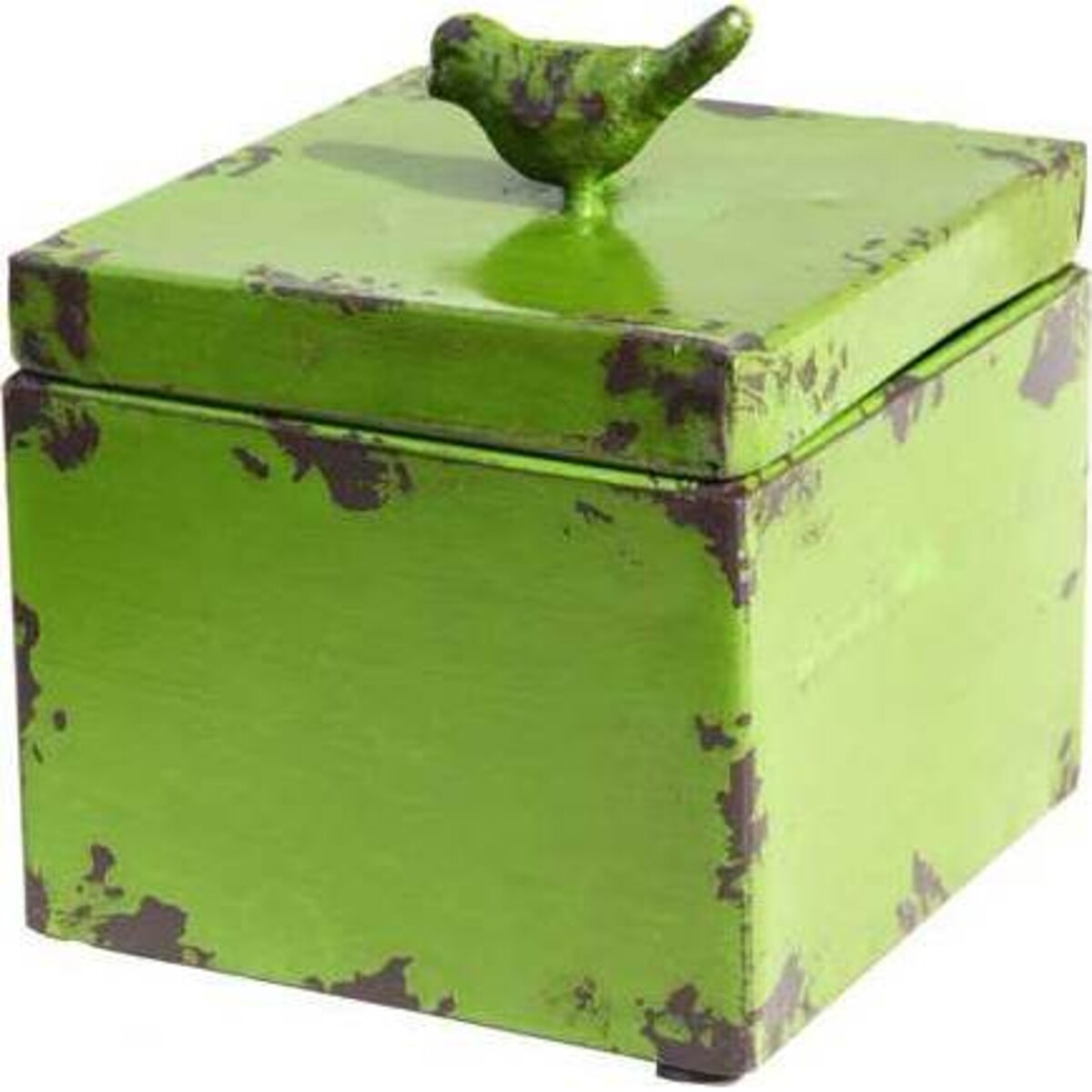 This simple but classic tin gives the impression of being definitely vintage, comes in a bright green colour. It has adequate scratches and peeled off paint to make it look like an antique yet has no dents or structural deformity. The lid is sturdy and closes firmly. The little green bird handle is its highlight-placed as if perching on top of the tin box, claiming its ownership. A wonderful colour pop to add to any corner of the interiors. This tin box will add a lot of charm to a dresser, a study table or even along with one's curios and collectibles simply by its unique presence. Large enough to store trinkets and little knick knacks. A lovely box to have on the bedside where one can open and keep rings and earrings. Simple, elegant yet catches the eye because of its colour and its chipped paint which in fact elevates its good looks to quite another level.