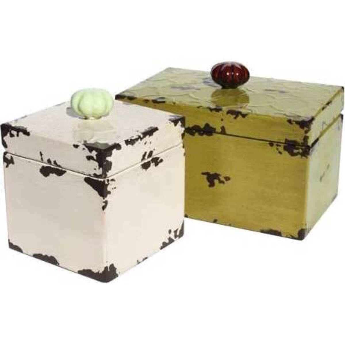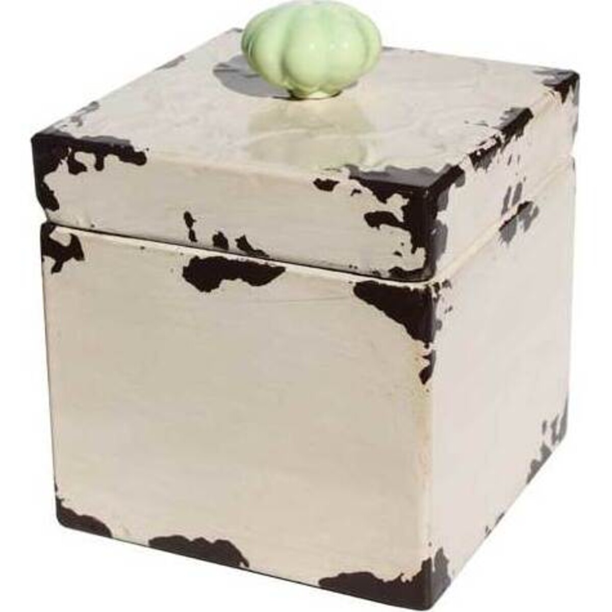 This little box features a cream exterior with dark brown detailing that gives the illusion of wear and offers a lovely contrast to the neutral base. At the top, a pale green knob allows for easy lifting of the lid. The decorative accent is large enough that you can store several small items _ from jewelry to makeup to candy _ while still being little enough that it doesn't take up an exorbitant amount of space. Thanks to its neutral shading, it can complement almost any colour and style of d_cor, especially that of country chic.