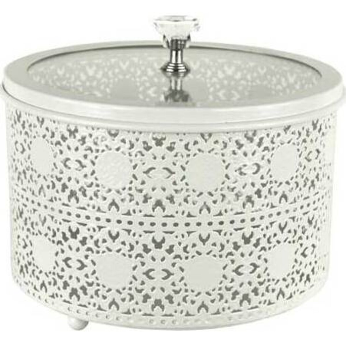 The dainty filigree work and the lid made in glass endows it a delicate feel .The look is ornate and the functionality would simply depend on how one would like to use it. Its size in fact is appropriate for usage as a trinket box, a herb box, a box to store all of one's precious little collectibles, and memorabilia. Apart from that, the finesse of the metal filigree in itself makes it so pretty that even as a standalone decor piece it will have its own impact. About 12 cm in height-this round box has a diameter of 17 cm that makes it also just right for placing cookies and delicacies that one wished to place on the table. Such a pretty addition to the home can well be used in so many ways. The glass lid can be wiped clean as can the interiors which is suitable for edible things being covered in glass. The versatility and the great looks makes it a must have piece from Lavida.