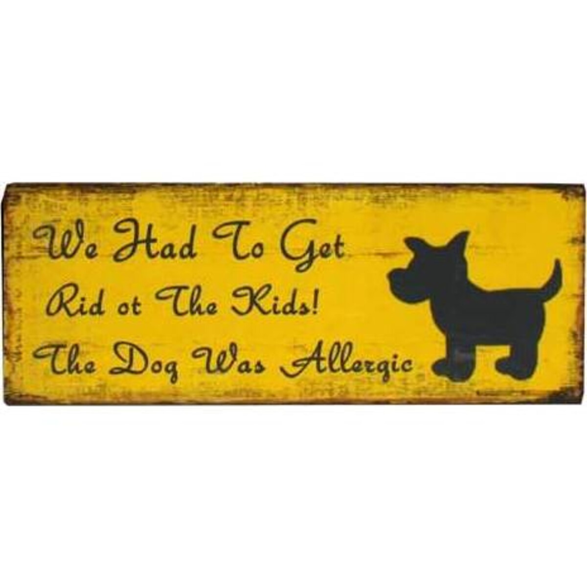 This horizontal yellow sign features black lettering that reads, "We had to get rid of the kids. The dog was allergic" as well as the silhouette of a small black dog. The edges of the sign are worn to give it a vintage feel. Put the sign on the front or back porch so anyone who enters will get a good chuckle, and don't forget to give this fabulous sign to all of your friends who have both kids and dogs running rampant around their home.