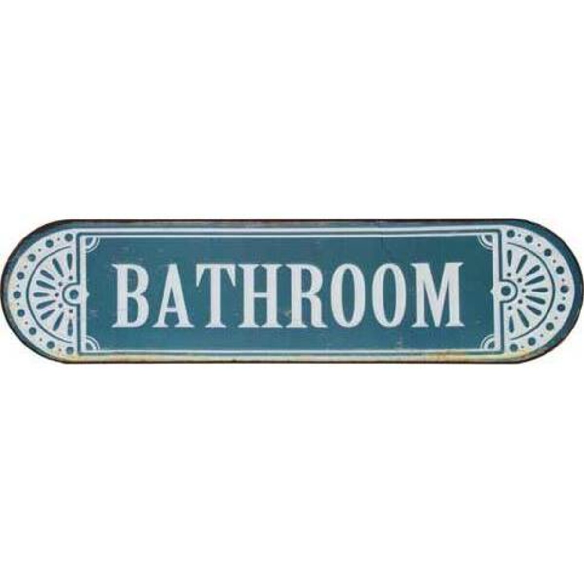 With a landscape design that's rounded at the edges, this bathroom sign features a blue background with a detailed lace-inspired design on either end and "Bathroom" boldly written in the center. The piece is slightly worn around the edges to give it a weathered feel. It would be great to use on the door to the bathroom in a home or at a restaurant, or even to hang in the bathroom as a cheeky little piece of artwork. It's a great way to add colour and style to the space without taking up a substantial amount of wall or door room.