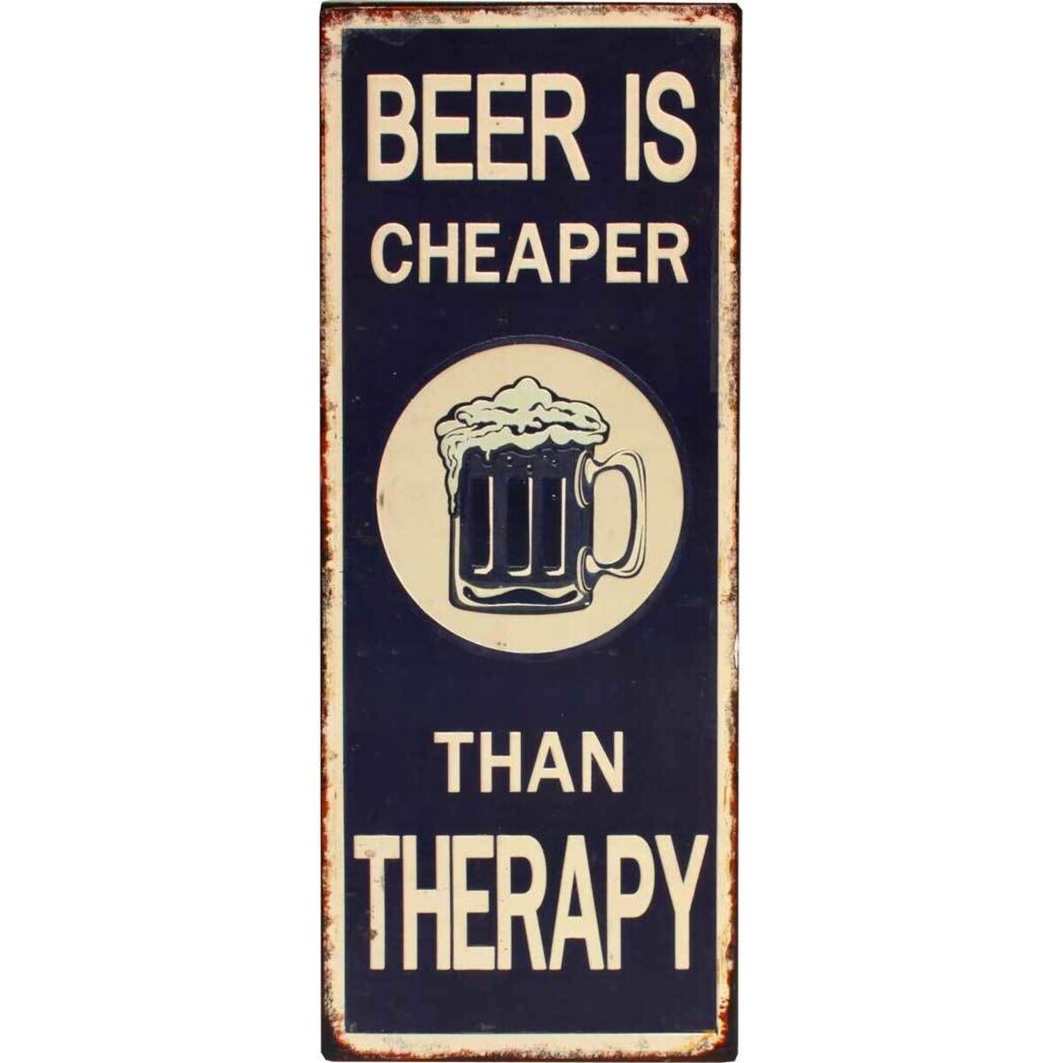 This black beer sign features a tan border, a tan circle in the middle featuring an ice cold mug of beer, and tan lettering that reads, "Beer is cheaper than therapy." The edges of the sign are worn to give it a weathered and vintage feel, as if this sign was plucked right out of an old dive bar in the middle of nowhere. Keep this sign for yourself and put it in the kitchen or in your home bar, then pass others onto your friends who love beer just as much as you do.