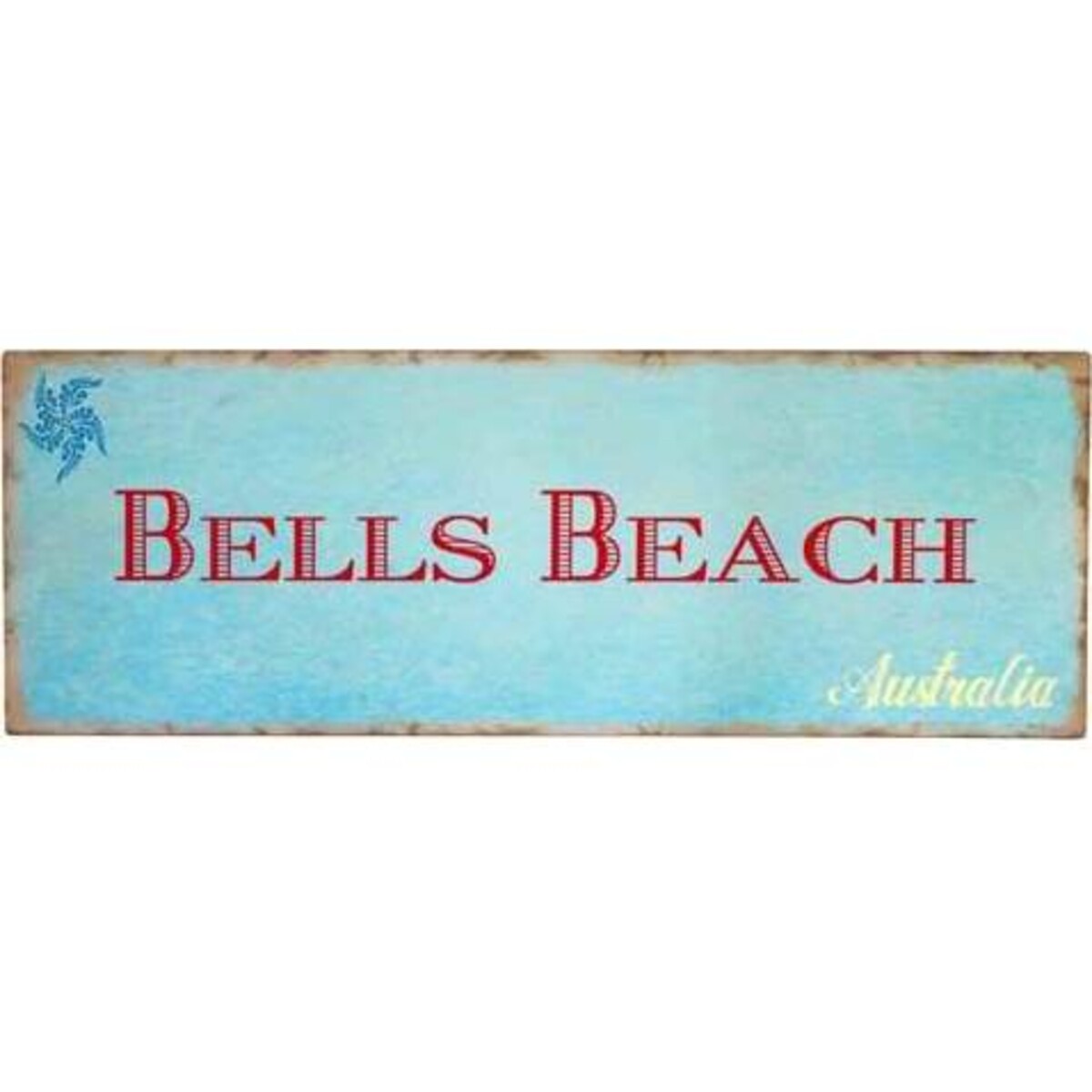 This light blue horizontal sign features the words "Bells Beach" in bold red lettering while "Australia" is written in elegant off white script in the lower right corner, and a blue floral windmill inspired design is featured in the upper left corner. The edges are darkened to give the sign an aged vintage feel, as if you picked the sign right out of your grandmother's attic. Place this sign anywhere in your home, especially in a room that's decorated in a coastal theme.