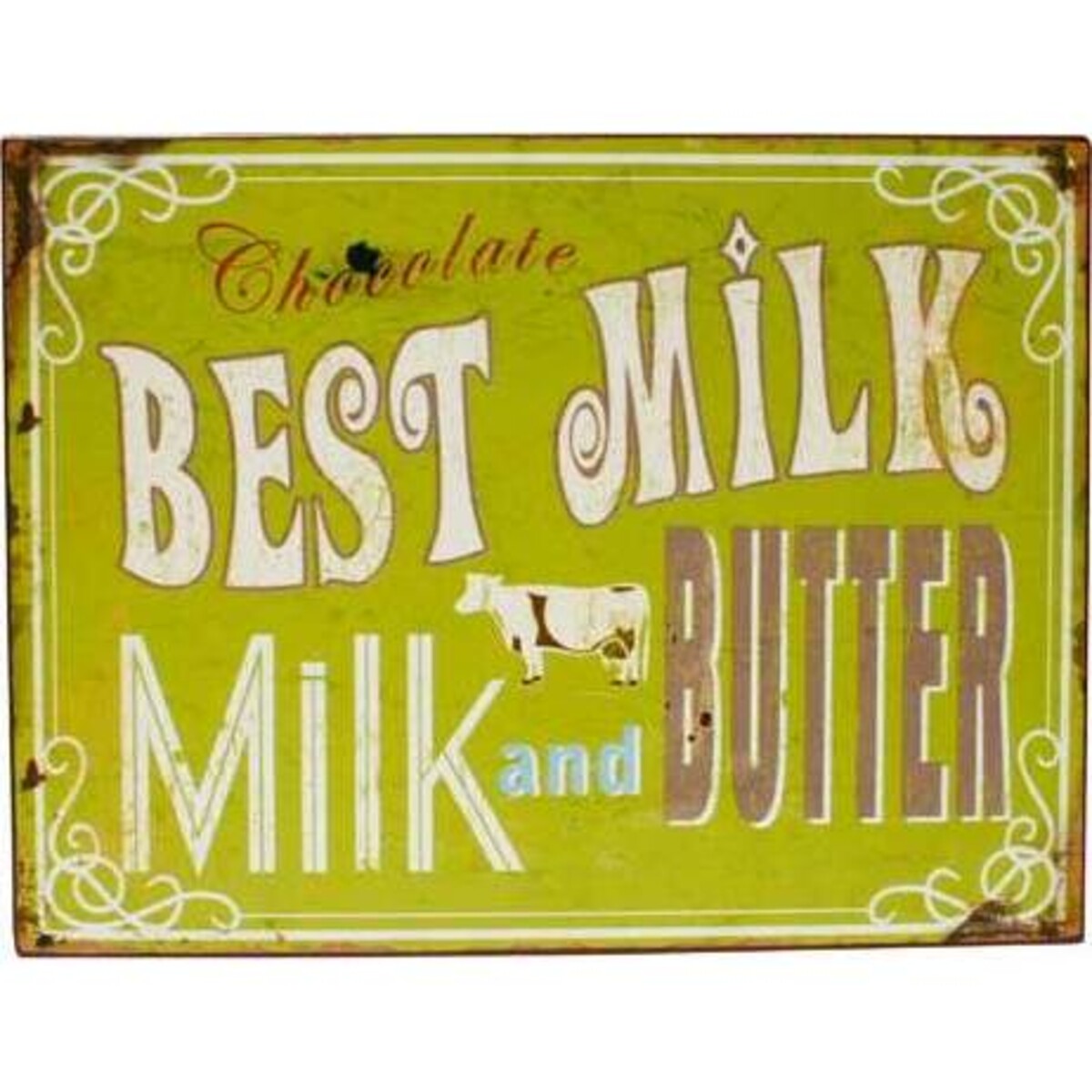 This tin sign will be appreciated by lovers of diary products, in particular chocolate and butter. The size of the item is 35 x 26 cm and compact enough to display in the kitchen, providing a little inspiration and colour for those hard at work cooking or preparing food. The design is bordered by attractive white-on-green patterning, leading the eye to the central image of a cow and the text printed in various fonts. "Chocolate", "BEST MILK", and "MILK and BUTTER" cry out from the rustic, aged looking sign, encouraging you to indulge in the ingredients and respect the use of fresh milk from the farm. The green and white colouring, as well as the natural feel of this tin sign is soothing and in keeping with any kitchen environment and will be popular will people who love to employ a healthy proportion of diary produce in their cooking.