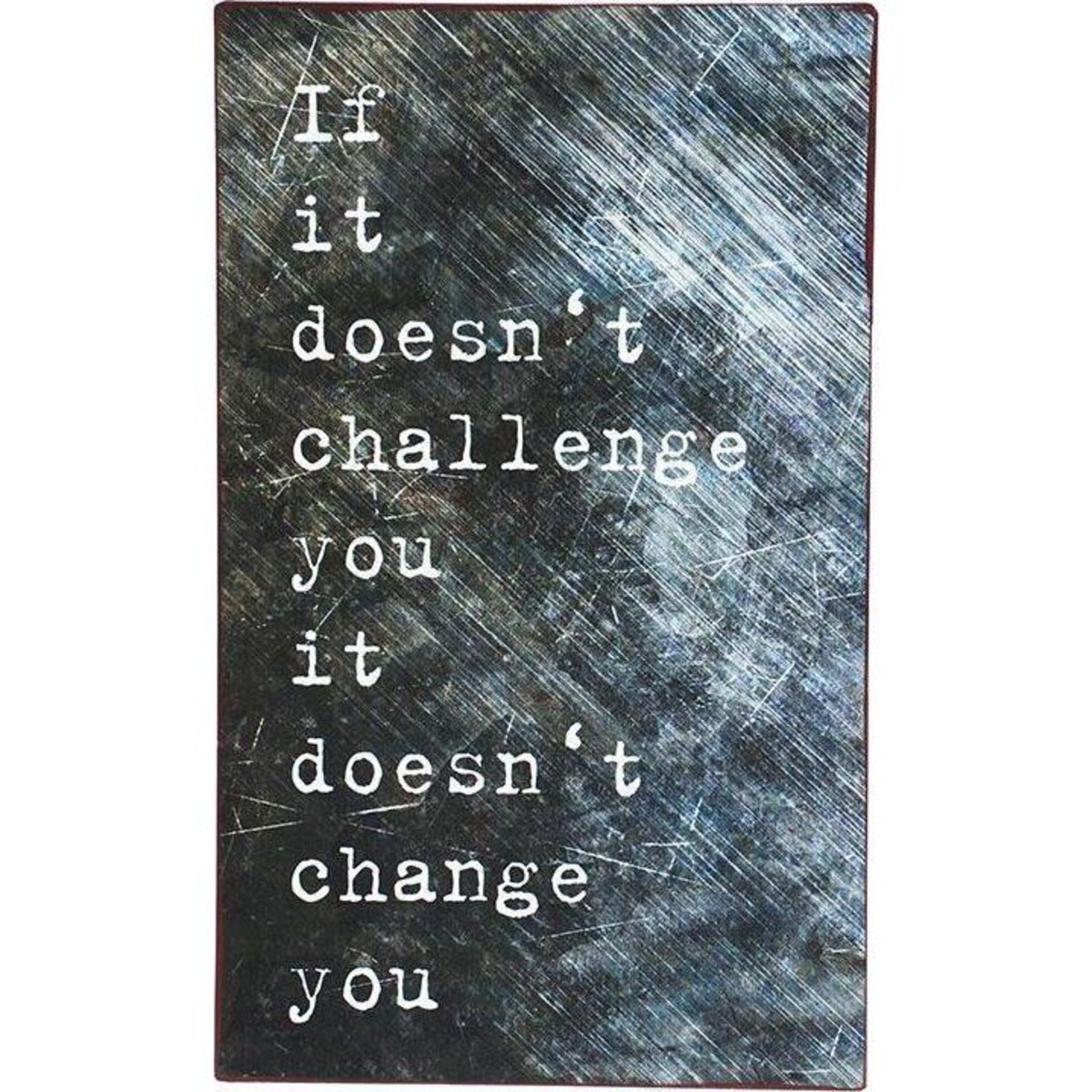 A sentence that holds an intense truth of life - if it doesn't challenge you - it doesn't change you clearly says what we all who love our comfort zone ?need to understand. It is in getting away from ones area of familiarity that one overcomes fears and inhibitions to emerge stronger and smarter. A lovely tin sign to add to the children's room, the study or your office space for it has the right content to take you have and beyond. The tin sign comes with a dramatic infusion of colour and pattern that is quite uniquely different from many. The deep coloured etchings on the metal surface adds the sense of power to the letters that convey so much meaning. The white lettering seem very clear against the deep gray blue backdrop that seem to look like it has been made from dense steel - almost conveying the steely resolve that all must have while facing new challenges and emerging as strong as the metal itself. This tin sign can be propped up against the wall as it is barely 38 cm in height and 20 cm in width.