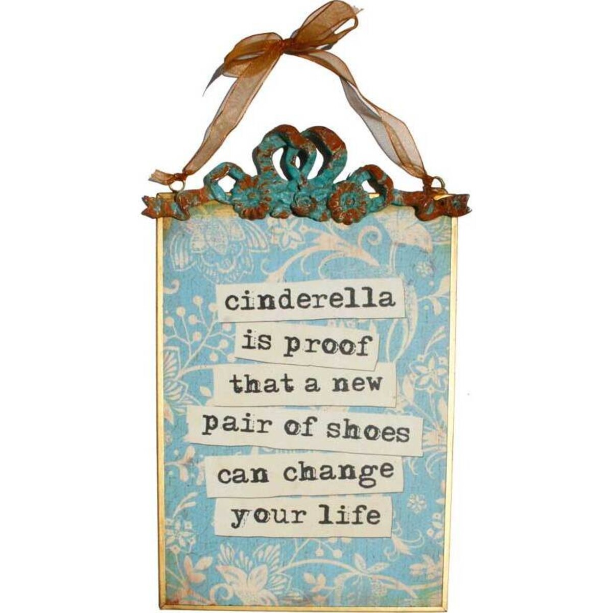 Suspended from a coloured ribbon, this tin sign exudes class, a style of yesteryear, and a theme relating to the famous fairytale. The aged look is complemented by the intricate patterning at the top of the sign in a rusty, aquamarine tone. Beneath, the central saying is framed by floral patterning in a light shade of blue that adds to the airy lighthearted effect of this piece. The message, "cinderella is proof that a new pair of shoes can change your life" can be interpreted in many ways - all positive and with a splash of humour. The overall feel is one of informality and natural colour and form, making this a desirable item for decorators and designers of living rooms, hallways, and bedrooms. This tin sign will perhaps be most popular with the ladies, lovers of footwear, who never need too much of a reason to shop for shoes. A quirky and humorous tin sign that will be very popular with friends and family.