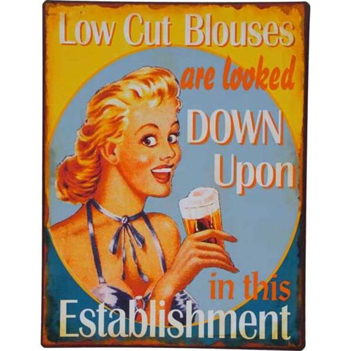 • This one measures about 10x14 inches. The surface is painted in marigold yellow, ocean blue, and sky blue, with the image of a 1940s girl holding a glass of beer. She's set within an oval medallion and wears a satin top with a tie around her neck. The sentiment reads "Low Cut Blouses are Looked Down Upon in this Establishment".