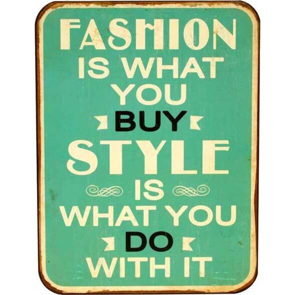 These green signs feature the saying, "Fashion is what you buy, Style is what you do with it," in cream coloured and black print. A matching cream coloured border accents the edges, and the sign is worn and weathered to give it a vintage look. The signs would be perfect in a bedroom, a dressing room, a store, or at any fashion school or business. With a sign this fierce, you'll want to put it everywhere. Keep one for yourself, but don't forget to pass them along to your fashionista friends who could use a little inspiration.