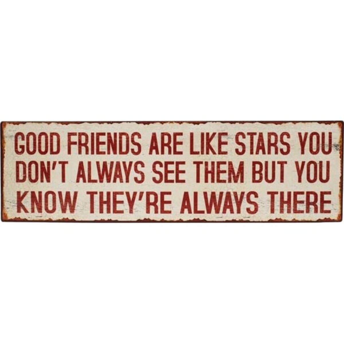 The edges of the signage are accentuated with the red smudge-like features. The center of the sign showcases the texts GOOD FRIENDS ARE LIKE STARS YOU DON'T ALWAYS SEE THEM BUT YOU KNOW THEY'RE ALWAYS THERE. The bold fonts and matching dark red letter palette contrasting the white background makes it standout.