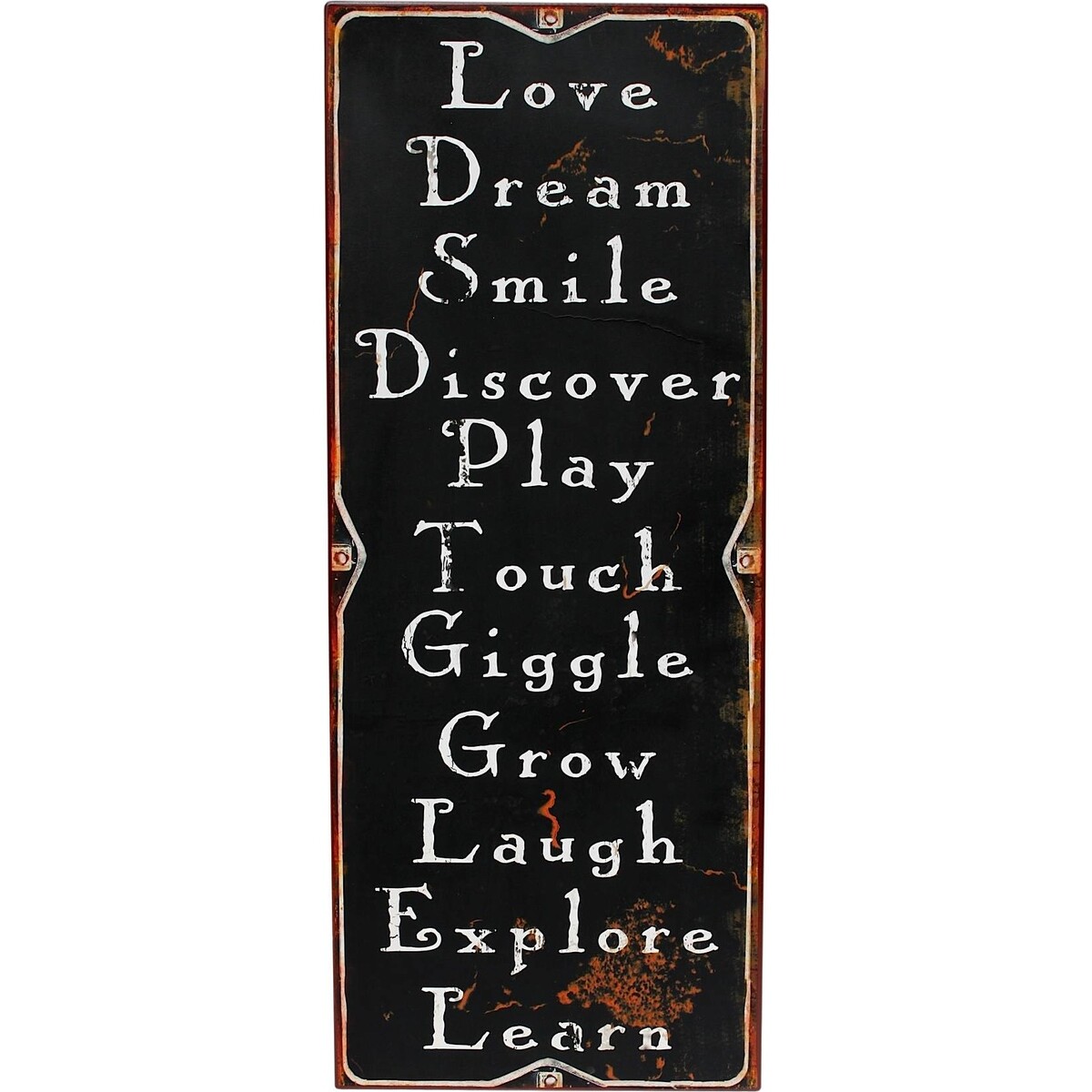 These metal signs fly off the racks in the store. Maybe it is because of their fun vintage feel. Maybe it is their bold design. These fun words are spelled on in white letters on a rusty, tin setting that is painted black. It says crisply on the front in block lettering: Love, Dream, Smile, Discover, Play, Touch, Giggle, Grow, Laugh, Explore, Learn. This sign is a great choice of d_cor for the playroom, nursery or the bedroom of a child. And they make fine gifts for your favourite teachers. Studies have shown that black and white patterns encourage the development of young minds. And often such posters help with learning to read.