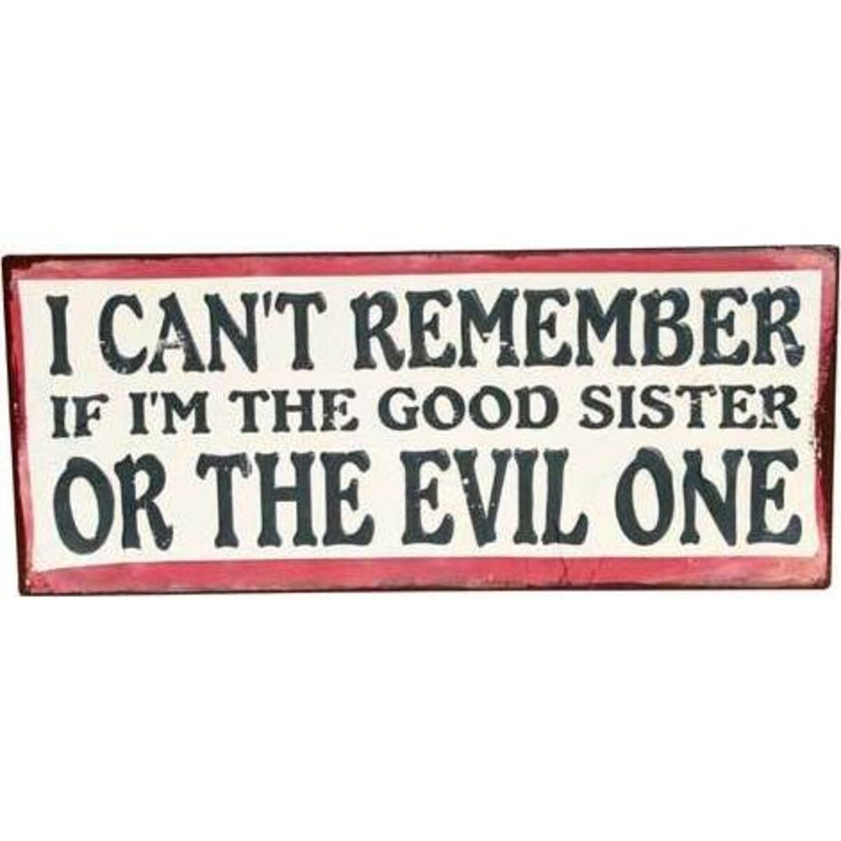 The white horizontal sign has a red border, and in black lettering, states, "I can't remember if I'm the good sister or the evil one." It's a cheeky sign that would look fantastic in almost any area of your home whether you put it on the porch or in your bedroom. Thanks to the shading, it can complement any colour scheme. Keep it for yourself or give it to your sister as a gift for any occasion from a birthday to a graduation gift. It's going to make a fabulous addition to any home it sits in.