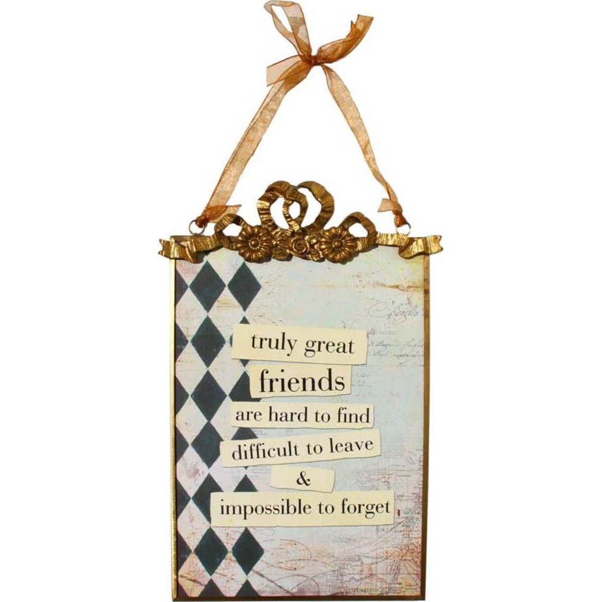This tin sign is finely crafted with detailed gold patterning above the main message imprinted on the rectangular sign. The background of the main surface includes a fading map and elegant handwriting to draw interest and add to the mystique. On the left hand side, a chequered pattern in black adds strength to the design, drawing the eye to the central saying, "truly great friends are hard to find, difficult to leave & impossible to forget". The tin sign can be suspended from a convenient point by the coloured ribbon at the top. This makes for easy use and ideal for homeowners who like to ring the changes quickly from week to week. The item is perfect for many rooms of the home - in the kitchen, hallway, or bedroom, and with its resonant message, will be popular with all.