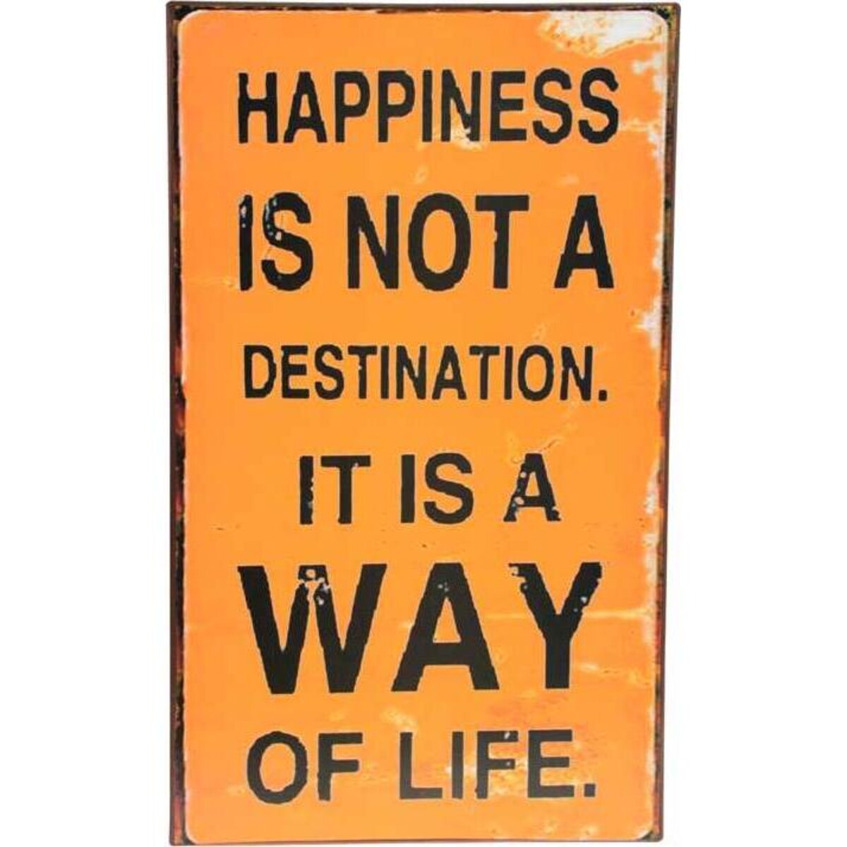 There are a lot of uses for this extraordinary sign. It is not exclusively decorative. It does more than accentuate homes, offices, schools and other venues. It simply provides inspiration and boost of morale for readers. Hence it is also a remarkable gift idea to celebrate milestones in life. This vertically rectangular frame is a stunning head turning piece. The sign shows off the vintage themed showpiece and the wisdom it highlights. The frame border is painted with faded and worn out features. It also has white scratched designs for a more outdated finish. Tin Sign Happiness Small is showcased with the hot orange colour base complete with the contrasting black letter text. The saying HAPPINESS IS NOT A DESTINATION. IT IS A WAY OF LIFE proudly occupies the central frame.