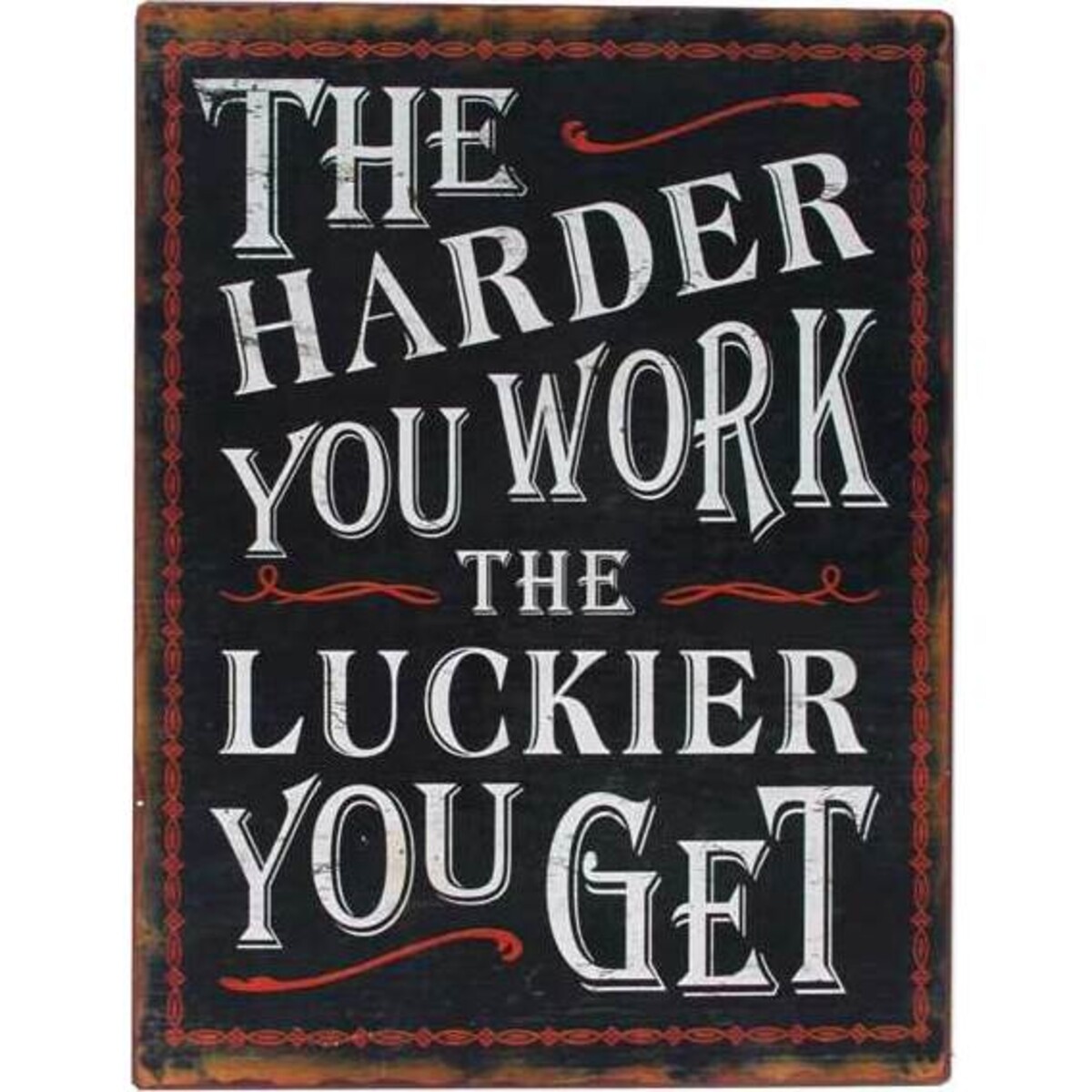 Introducing the Harder Luckier Tin Sign from Lavida. This black sign features a thin red embellished border, and in white wording, reads, "The harder you work, the luckier you get." Along the edges is slight orange wear to give it the illusion of weathering, as if it's been sitting on an antique shelf for years. Put this sign anywhere around your home where you need a good dose of inspiration on a daily basis, and you'll constantly be reminded that often, hard work leads to plenty of luck.