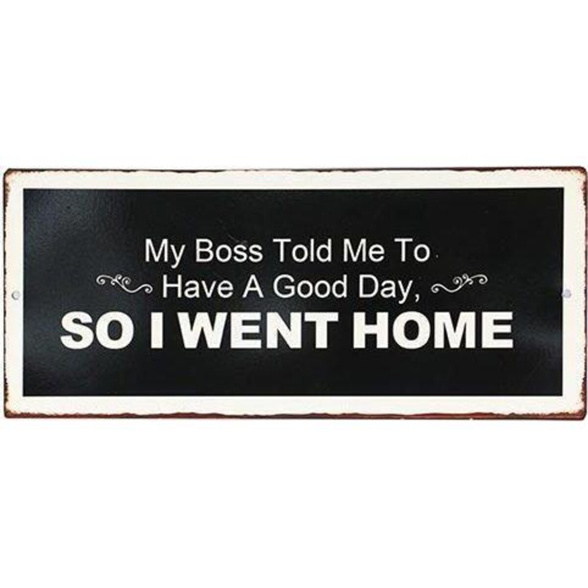 Tin signs that carry messages make for wonderful display. This one albeit quirky conveys the love one feels for one's home. The edges with its obvious visible rusting and the simple paintwork on the board - all add to a sense of age and vintage appeal that is what most sign board tend to have - here however it conveys a certain warm feeling of comfort and love - a love that runs deep - and along with that is a parallel humor. The reflection of the modern times when the heart lies near the hearth but earning the daily bread takes him or her far away from where the heart really is! The sign board is made of metal and is about 31 cm long and just about 13 cm in height. The black backdrop with white lettering making it bold and visible even from far. The tin sign has a white border which strikes a contrast alongside the rusting edges. Such sign boards can be place in any part of the home that deems to get itself into a retro feel.