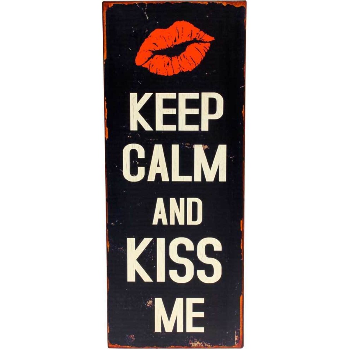 A set of sexy red lips at the top of this tin sign sets the tone for the message beneath: "KEEP CALM AND KISS ME". The striking bold white capitals against a black background allow this evocative message to be broadcast loud and clear. Despite its forward nature, the tin sign is carefully designed with a rustic 'rough' look - the edges imperfect and the main surface worn. This gives it a look of sexiness and menace that it sure to attract the attention. This idea is a lot of fun and is sure to raise a smile with friends and family. The design is ideal for the bedroom, or for the more adventurous, the kitchen, or living areas. A touch of humour and a little romance will put people at ease, and this sign certainly delivers in that respect.