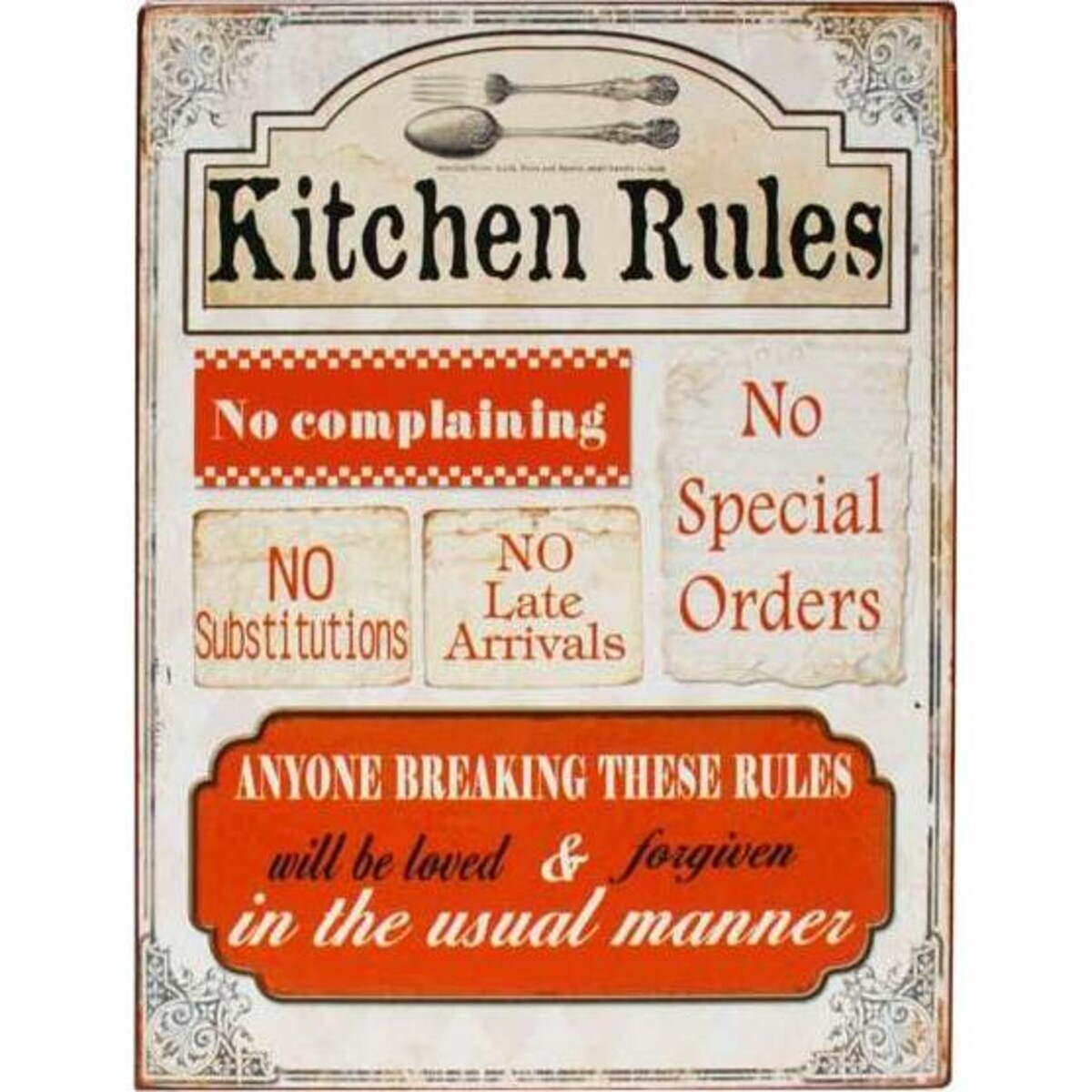 This tin sign is very traditional in look and design, but lays down some rules that stand the test of time. The artwork is beautifully designed with intricate patterns surrounding the central messages on a whitewashed background. The shades of red and white imbue a warm, welcoming feel and the text is printed in different fonts and sizes to add variety and interest. "NO Substitutions", "NO Late Arrivals", are two such commands - balanced by a message of love and forgiving below. Family members and visiting friends will appreciate this tin sign for its informality and humour. The design, too, is perfect to fill an empty space or liven the mood. The variety offered within the messages, agreeable colours and style of this tin sign, enables it to hold the interest and be a comfortable part of any kitchen for months and years.