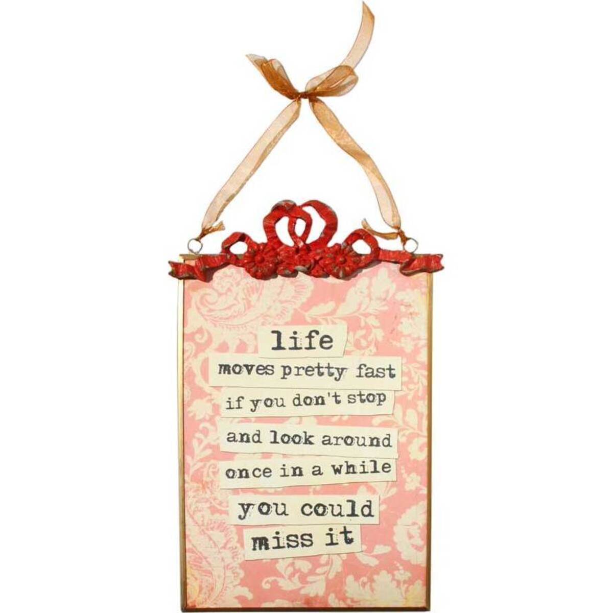 This beautiful tin sign displays elegant patterning in subtle shades of red and cream. The crest-style patterning at the top of the sign is in the deepest red and perfectly decorates the item. In the centre, the message in black lettering is prominent and thought provoking: "life moves pretty fast. if you don't stop and look around once in a while, you could miss it". With an attractive ribbon attached to the upper corners of the sign, it can be suspended easily from a convenient point around the house. Although the message is poignant, the reds and subtle hues of this item make it ultimately romantic - perhaps a message from the older, wiser heads of the family. In this sense, it would make a fine gift, a gesture for a loved one or close friend. With its classy look, this tin sign will be effective in creating a peaceful atmosphere in any room of the house.