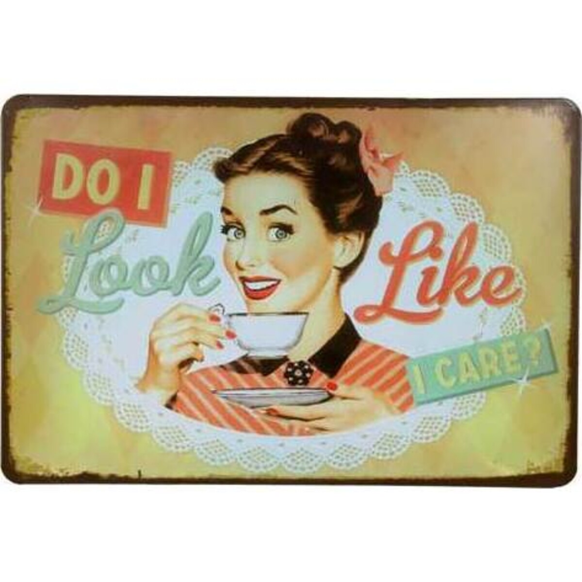 Tin sign Like I Care, portrays an attractive woman sipping a cup of beverage with her face shining in optimism. The words ‘Do I Look Like I Care’, are displayed all around her. This sign is boldly asserts that one is free from the troubles of life. It can be an outstanding memento reminding one of why to face the challenges of everyday living in a resolute spirit of faith. Tin Sign Like I Care has dimensions of 30x20 cm and may be fixed onto the wall on a bedroom by a lady to keep herself focused on enjoying the finer moments which come by every so often.