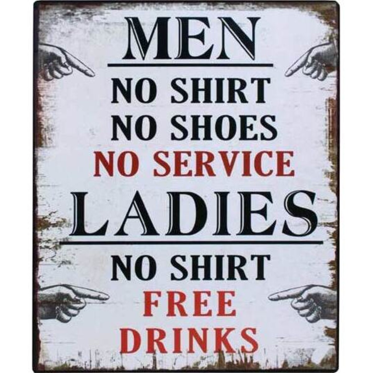 This white sign features black and red lettering that reads, "Men no shirt, no shoes, no service. Ladies, no shirt free drinks." There are images of two hands on either side of the sign pointing inwards at the wording as well as darkening around the edges of the sign to give it a vintage feel as if it were plucked right from the walls of an old dive bar in the middle of nowhere. Hang it in your home or business wherever you want to make sure it gets noticed and grabs plenty of attention.
