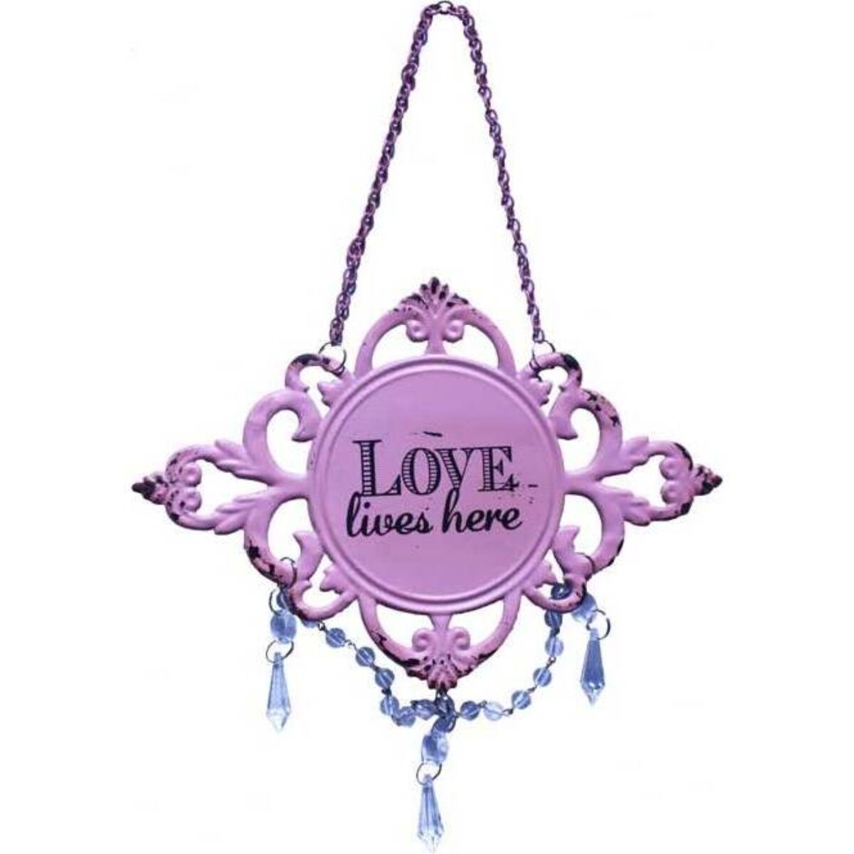 These lavender signs each have a circle at the centre that features black lettering that reads, "Love Lives here," as well as an ornate filigree design that's formed into a diamond shape around the centre. Lavender beads hang from the bottom, and at the top is a lavender chain to allow for easy hanging. The signs are slightly worn to give them a vintage feel. They're ideal to put in any room of your home, whether it's in the bedroom, living room, or even on your front or back porch. They'll also make for fabulous gifts.