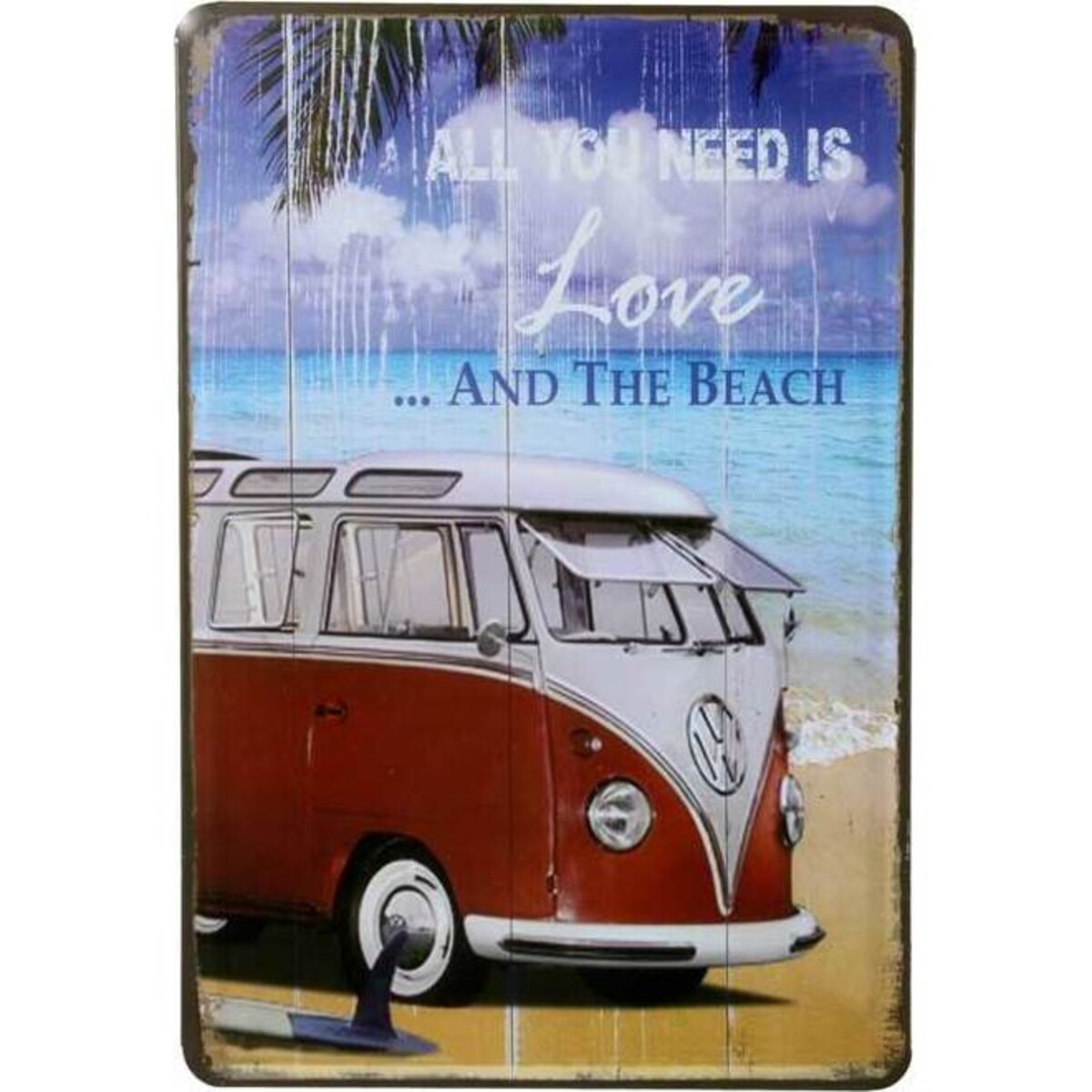 Tin sign Red Combi features a rectangular signage material with measurements of 20x30 cm. This sign is constructed using tin. The calm sea is visible at the background of a red and white combi, parked casually at the beachside. The words ‘All You Need is Love and the Beach’ are prominently displayed at the upper section of this image. Owners of businesses such as entertainment joints may obtain a couple of these signs and exhibit them within their premises. They may be placed at easily - notable spots. Multiple leaf - blades of a palm tree hang low on the combi, whereas a surfboard is positioned on sand next to its wheels.