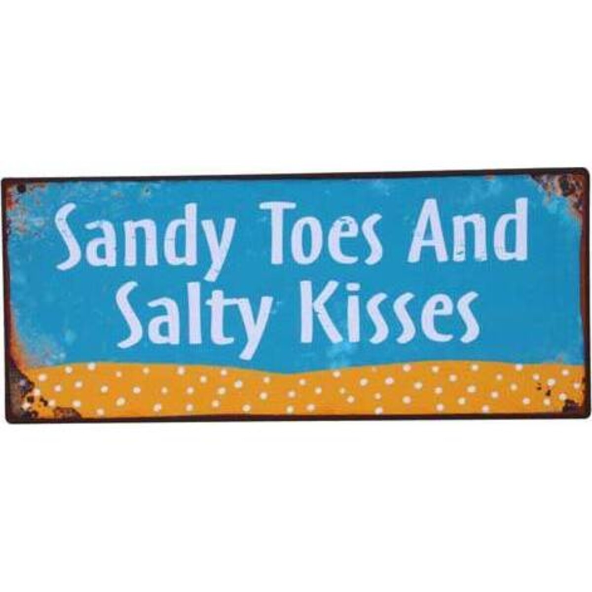 • The Sandy Toes Tin Sign is warm and comical, suggesting a languorous day at the beach with someone we love. The words "Sandy Toes and Salty Kisses" is emblazoned in white on a sea blue background, and golden yellow sand runs across the bottom with white polka dots completing the design.