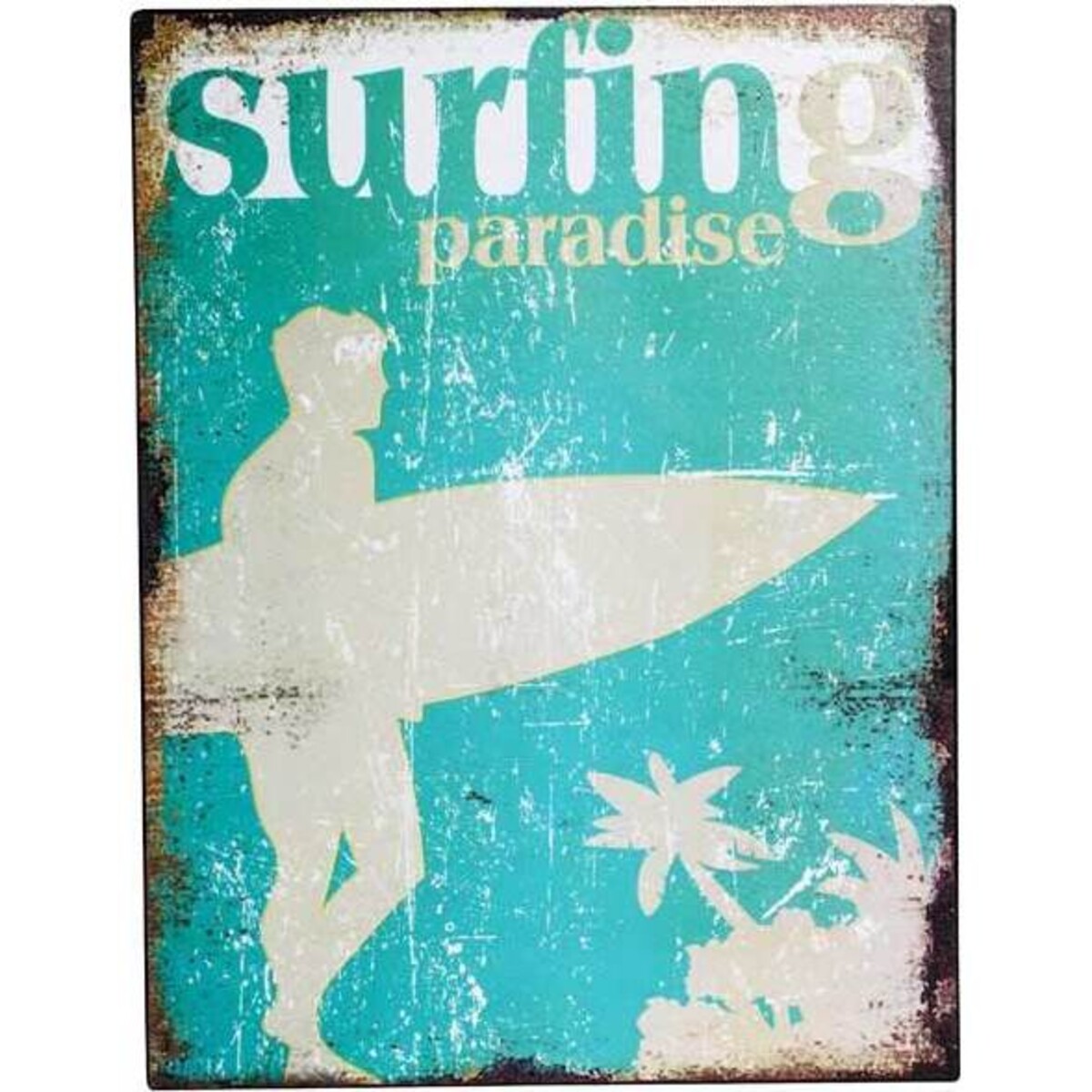 This sign consists of a blue and white background with the silhouette of a surfer carrying a surfboard in the lower left corner, and in the lower right are a small collection of palm trees. At the top of the sign are the words "Surfing Paradise." The edges of the tin sign are slightly worn to give it a charming weathered look. Whether you hang this sign in your garage next to your surfboards or in the living room above your favourite chair, you're going to love looking at it on a daily basis.
