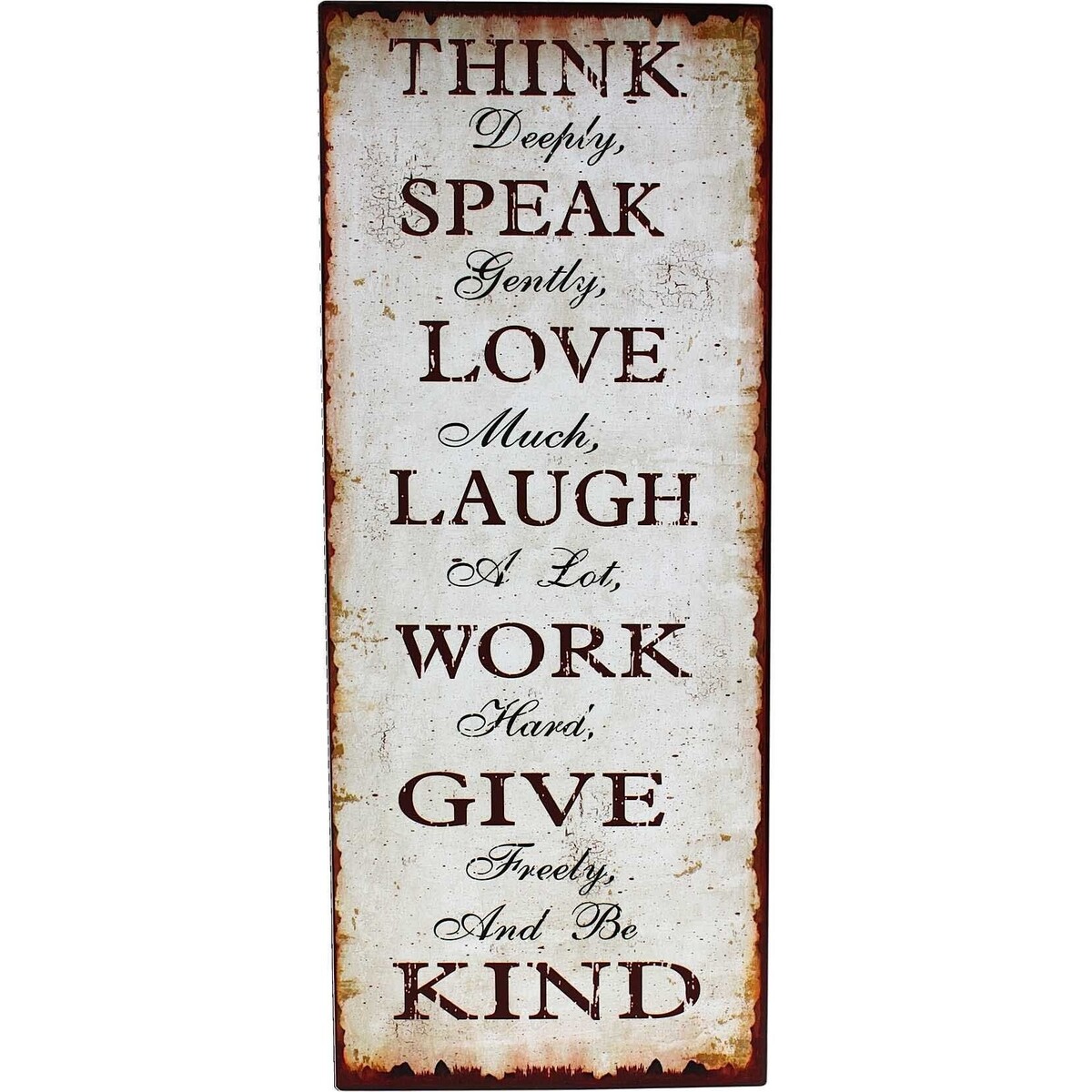 The poem appears to be written on a creamy piece of parchment in rust coloured calligraphy that contributes to the feeling of an old fashioned memento hanging on the wall. The rustic painted sign is weathered and rusty in order to make it resemble an authentic antique. A daily reminder of how to live well, it reads simply: Think deeply, Speak gently, Love much, Laugh a lot, Work hard, Give freely, and Be kind. The first word of each phrase is printed in bold letters to accent the cursive script of the descriptive adverbs that follow them. These Tin Signs are one of LaVida's best sellers, and with good reason. This could be just the thing for anyone to appreciate all those little things in life. The little things such as the Think Tin Sign.