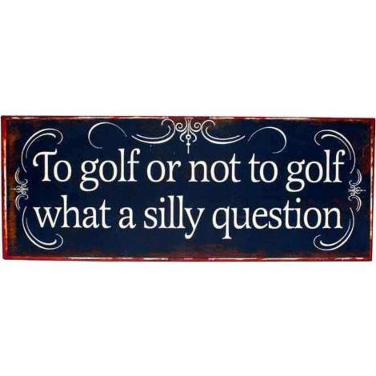 This tin sign is striking and forthright with its dark background, wide aspect, and bright lettering. The style could hark back to the early 20th century with the traditional patterning surrounding the message. "To golf or not to golf... what a silly question" is clearly a message aimed at enthusiasts - fanatics even - of the leisurely pursuit. This tin sign would be a fine addition to a golfer's storeroom, bedroom, or hallway, where the message will create a smile and lighten the mood. Despite its humorous nature, the sign is beautifully styled with an attractive rustic-red border that frames the patterning and letters. The font too, is carefully selected to add class, but also to be legible. At 46 x 18 cm, the tin sign is compact enough to fit into many spaces in the home, outside areas on the patio, or even in the garage. This item is bound to be popular with people of all ages and a fitting addition to a golf-mad home.