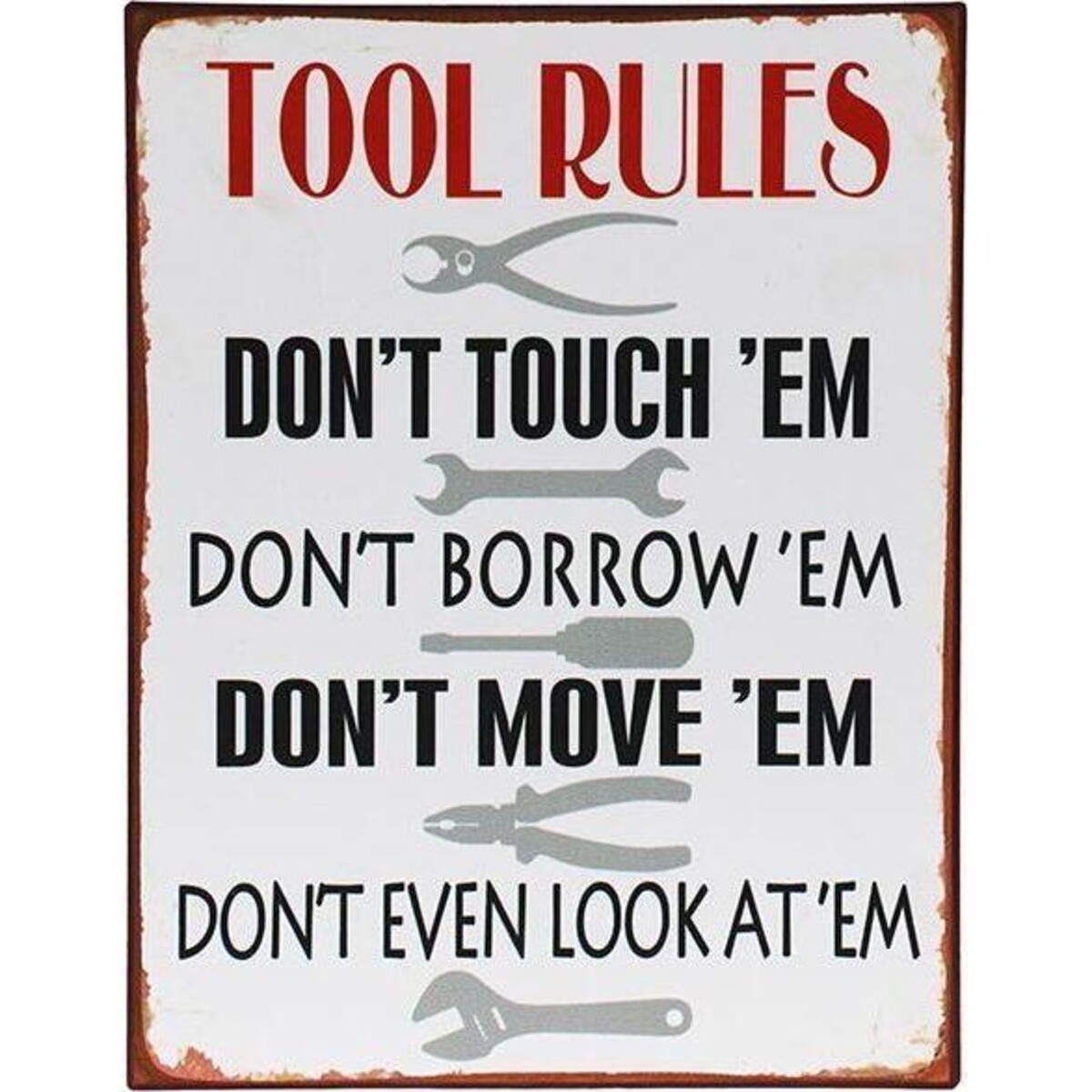 Tin signs add this little spot of interest to your home and when it comes to the usage of great humor, just the right choice of words as well as the depiction of ideas, there are few things that can compare to them. This tin sign with its lovely graphics brings out the possessiveness with which a man guards his much loved set of tools and how many rules he would want to lay down for its usage. Place this in your den, the study, your little nook or in any part of the house where you wish to build in your little touch of personality - because this is a tin sign that has dollops of it - a strong personality and a personal touch. Made of metal, it has the words very clearly printed across it - with clear graphics and a lovely muted colours combination. The rusting edges, the usage of power filled words - a lot of don'ts makes it an impactful little sign board that makes the rules amply clear. The size too is the kind that can be used in any space however small or large. It is about 35 cm tall and 26 cm wide and makes for quite an impressive display.