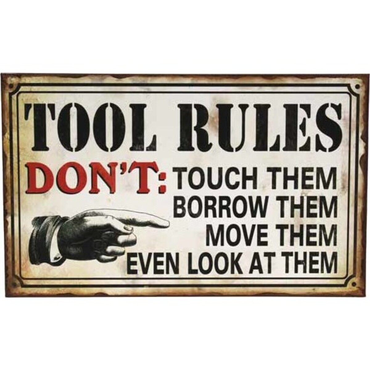 The message on the Tin Sign - Tool Rules is pretty straightforward and doesn't take much to understand and digest. They may come across as amusing or demanding, depending on how the onlooker wishes to interpret it. The design of the tin sign will pretty much match the rugged atmosphere of a blue-collar workplace.