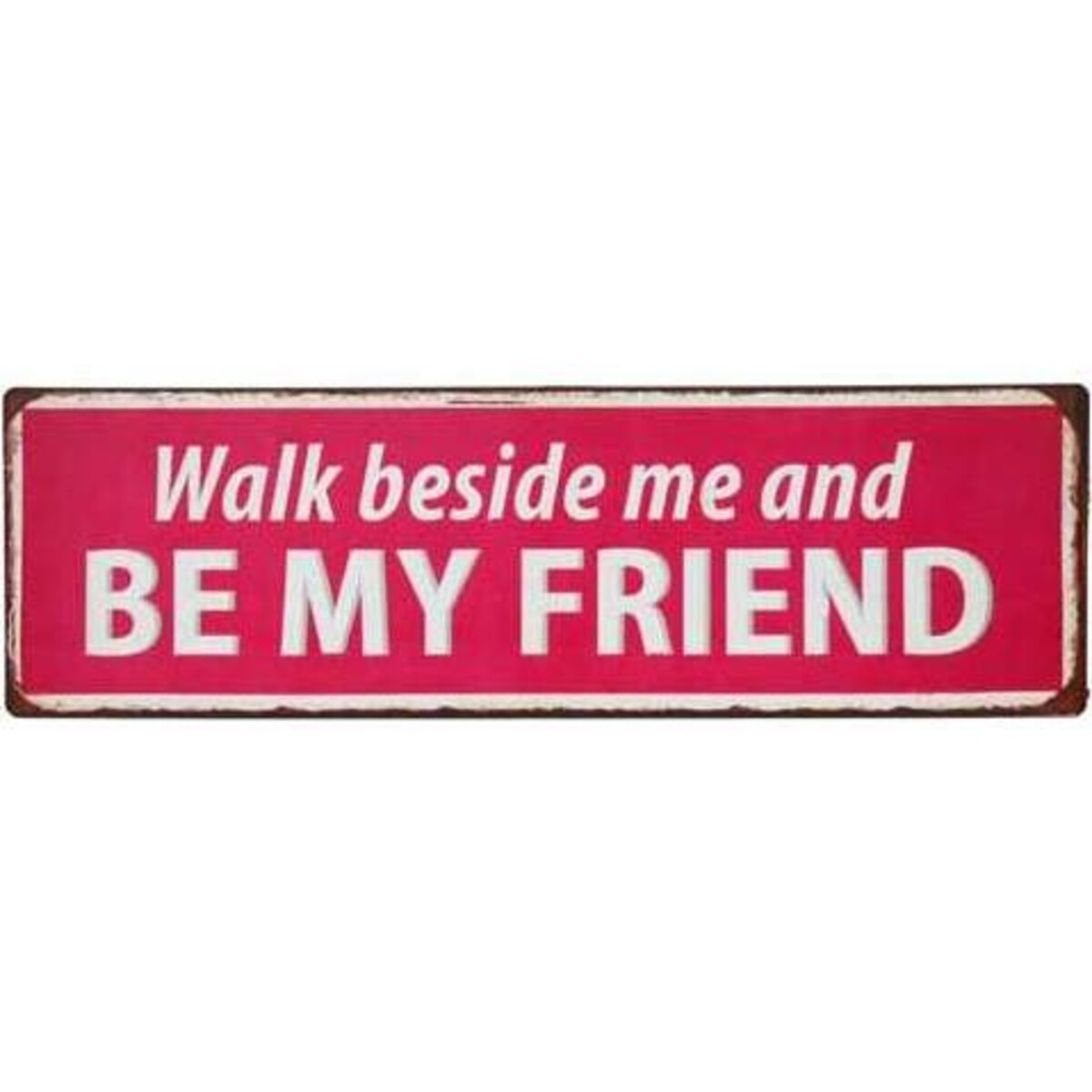 é The sign is done in red with a white border and white lettering that reads "Walk Beside Me and BE MY FRIEND", with distressed edges that make it appear as though it's become rusted throughout the years.