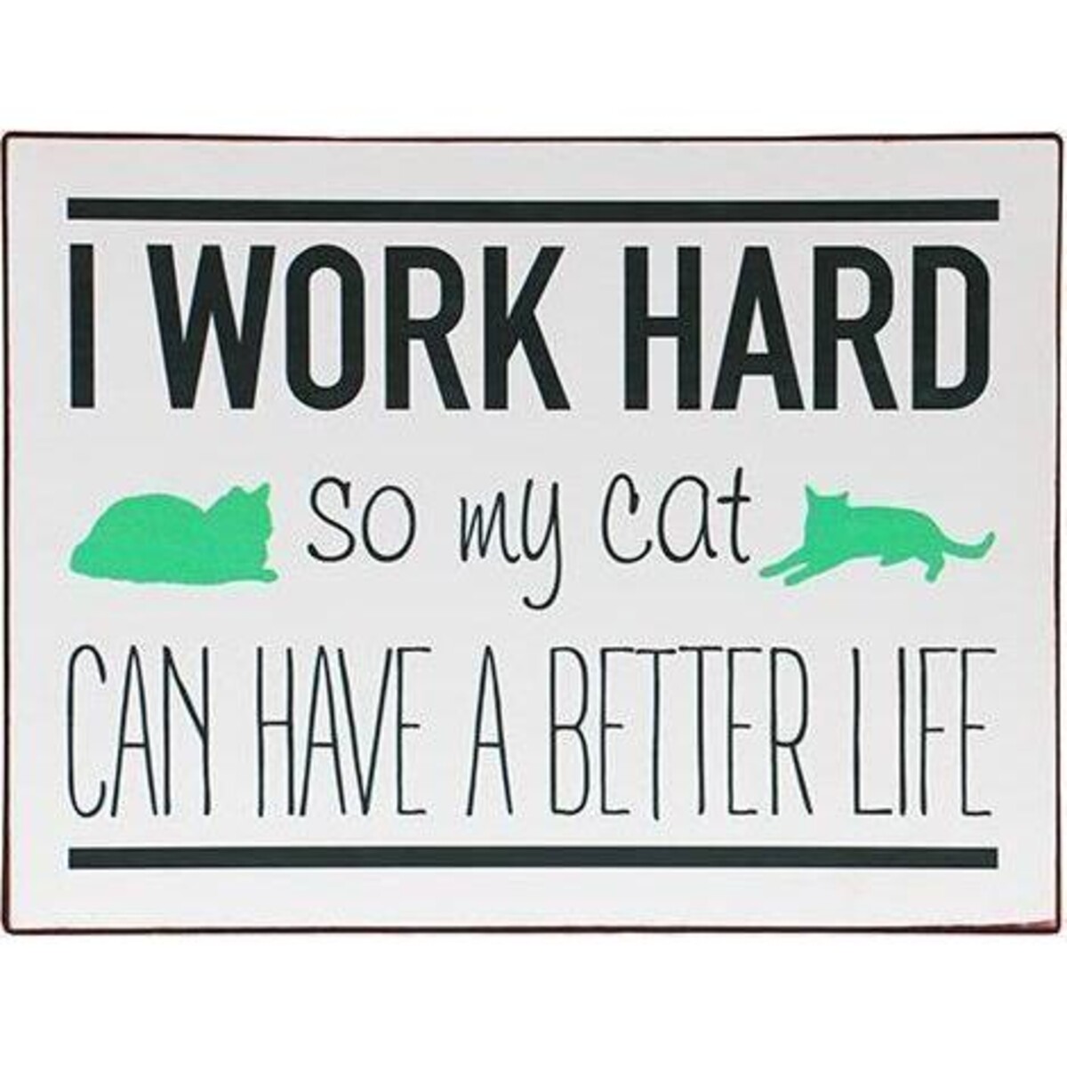 This tin sign is a little quirky quip on how you find your cat the biggest motivation in your life - the one motivation that makes you want to strive harder to do well in life and make more money so that - your cat can have a better life! Only those who are bitten by the same cat bug would fully appreciate where that sentiment is coming from! Be bold enough to declare this love so deep by adding tin signs that are as quirky as your love for your little feline friend. It's made of metal, comes in a long sleek size that is most desirable in terms of looks and proportion and could be placed with ease on mantles, table tops and corners. Will be easy to display on the wall and will look rather attractive. The colours are mainly black, white and a touch of blue. It is 35 cm wide and 26 cm tall making it just perfect for a personal display in your den or the children's room. Add a tin sign as it helps you add that informal touch filled with humor to your spaces.