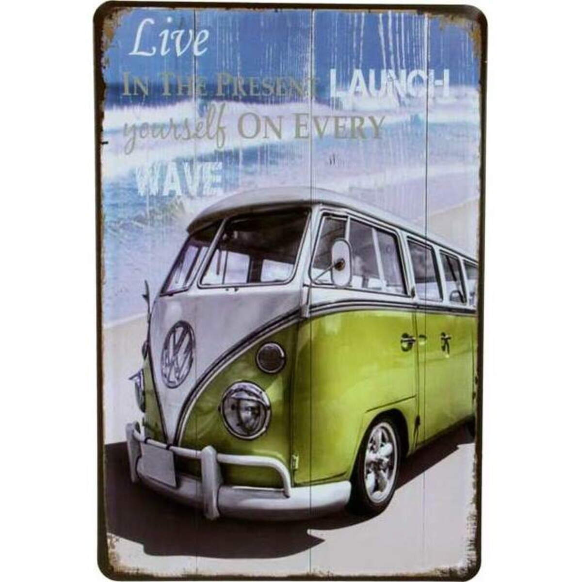 Tin Sign Yellow Combi comprises of a rectangular sign - board that measures 20x30 cm. A combi marked in yellow and white stripes is easily visible. It is parked on a beach with a tidal wave depicted on its background. This sign features the words éLive in the Present, Launch Yourself on Every Waveé, which are written at its top part. People may acquire this product and place it just outside the main door or at the garden. Business owners may also acquire Tin Sign Yellow Combi and use it as a point of attraction for guests to their joints by placing it at a central location, such as next to an entry - way.