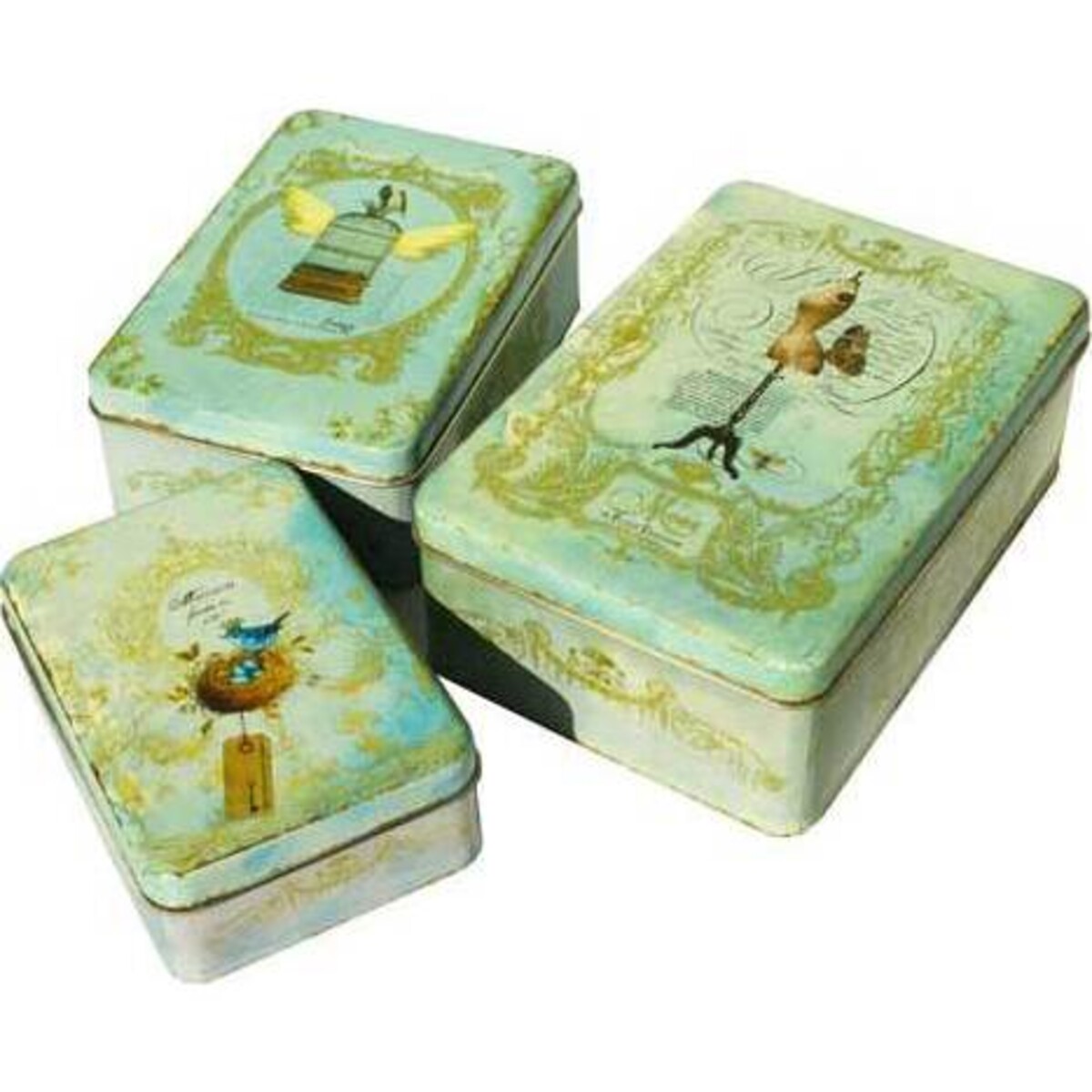Eggshell blue, in variations of tone and depth, create the background for the Victorian - era images on LaVida's Tins Eggshell Blue S/3. Each tin features a different print, including a bird's nest, a bird cage and a French dress form, rendered in soft golds and browns to complement the eggshell blue. Golden garlands, borders and swags adorn each image for more vintage charm. Each tin is of a different size and each features a lid and decoration on all sides. These tins could be used as a grouping in a bath or bedroom for a truly feminine touch, or put to use in holding small keepsakes.