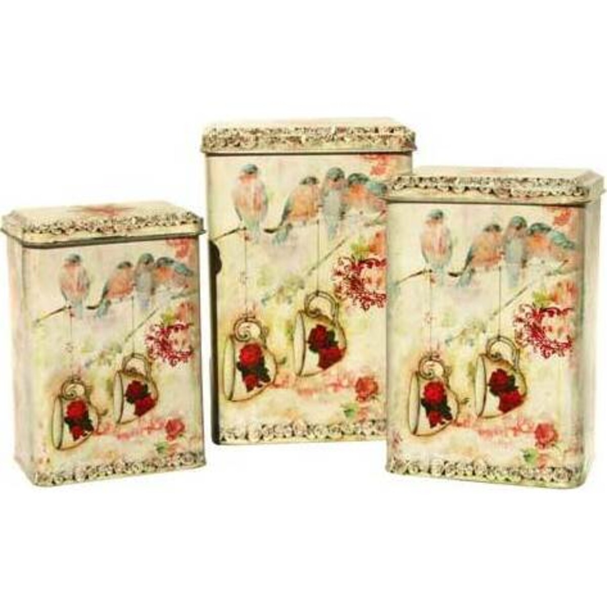 A gathering of bluebirds in soft tones of blue and rosy pink add country charm to LaVida's Tins Teacup Birds S/3. Each tin features an image of four bluebirds perched above a set of hanging teacups. Along with the birds, roses adorn the tins at every angle - from the deep pink roses on the teacups, to the soft roses in the image to the row of roses along both the top and bottom of each piece. This three - piece set can be displayed as a sweet, country accent or even used to store small items in a bath or on a vanity.