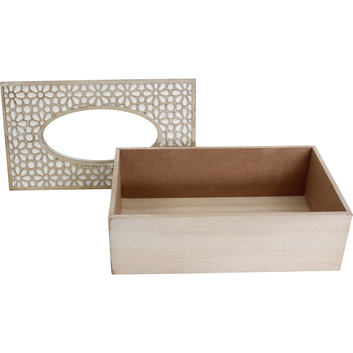 Rectangular in shape and long in dimension, this Tissue Box Daisy has an undeniable tissue paper storage and retrieval practical functionality. This is made possible through its use of best quality medium density fibreboard materials with its interior having a wooden brown palette while its exterior is finished in a white lightly painted hue. This is except for the lid which can be completely detached and that has its top surface patterned with lovely sunflower shapes before being painted richly in white hue.