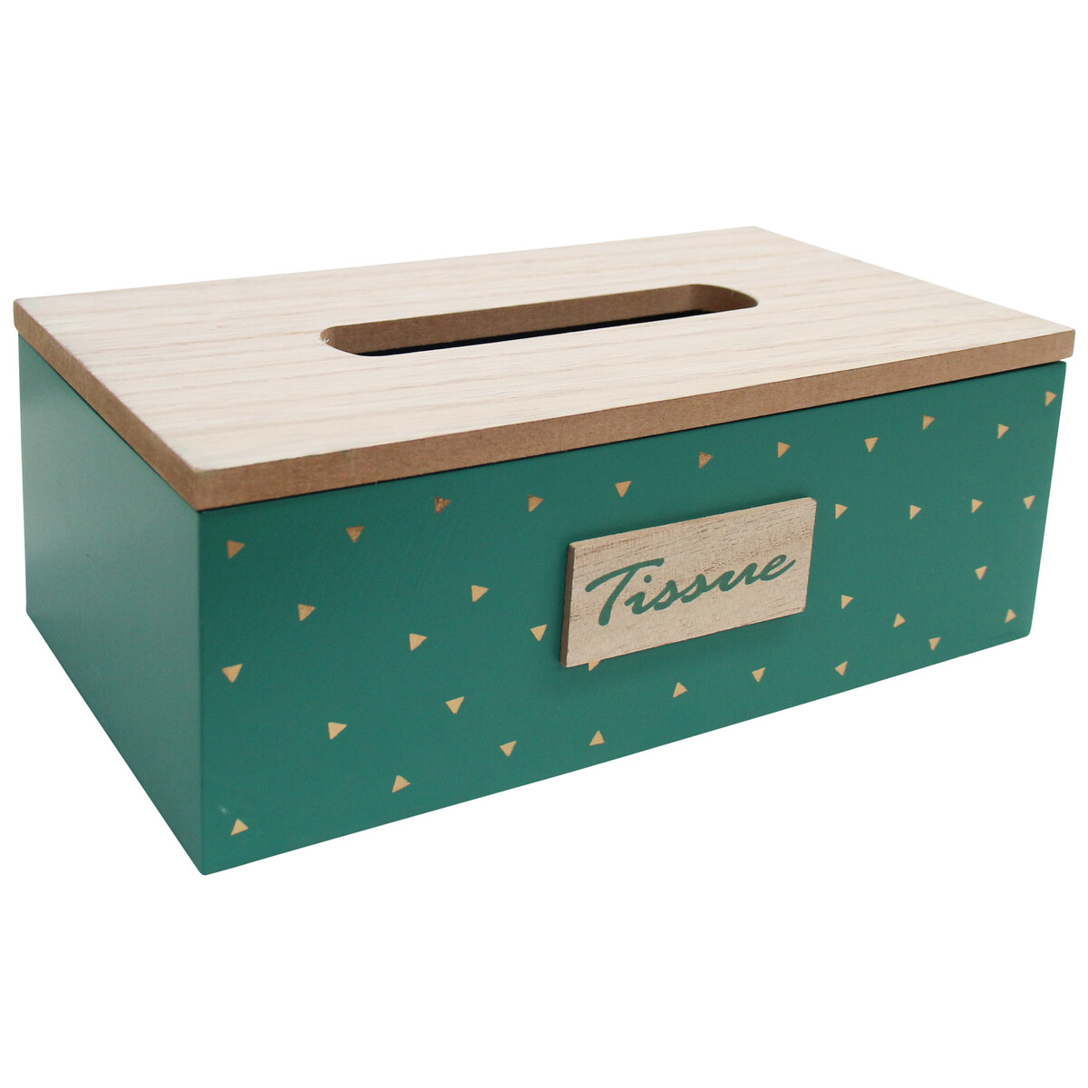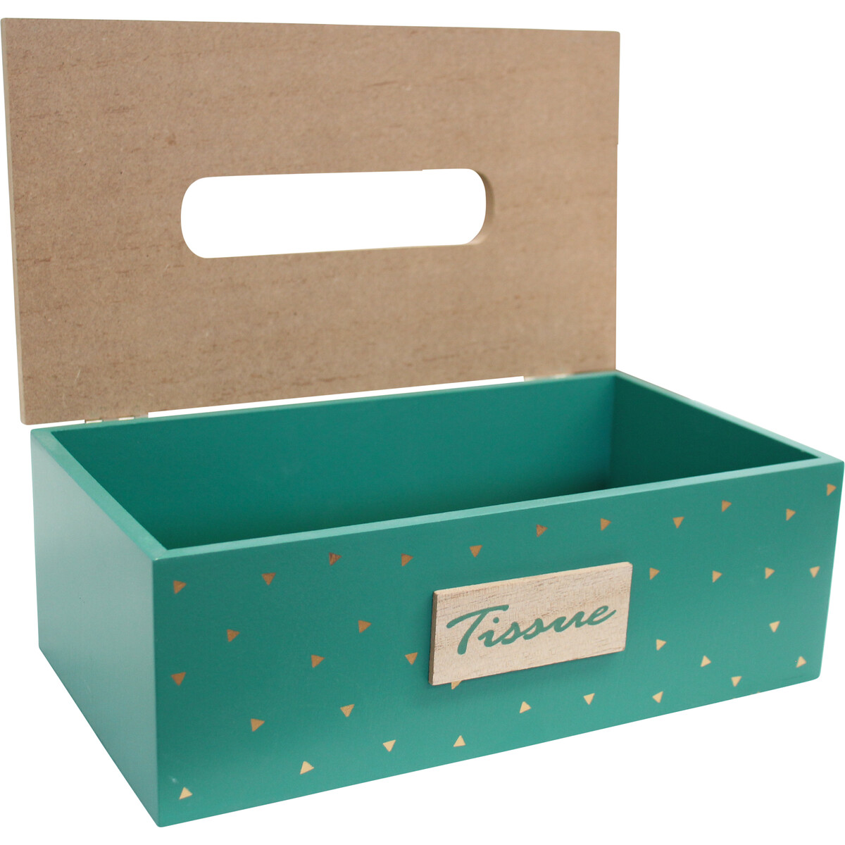 Constructed in a long rectangular shape in a large sized dimension which measures 25 centimetres in length, 14 centimetres in width and 9.5 centimetres in height, this Tissue Box Indie was made large and spacious with the purpose of being able to contain more tissue papers. It is crafted using high quality medium density fibreboard material. The box itself is painted in an alluring jade shade of green with the front decorated with several small gold coloured triangles while the lid is left in its wooden brown palette with a slit for easy tissue removal.