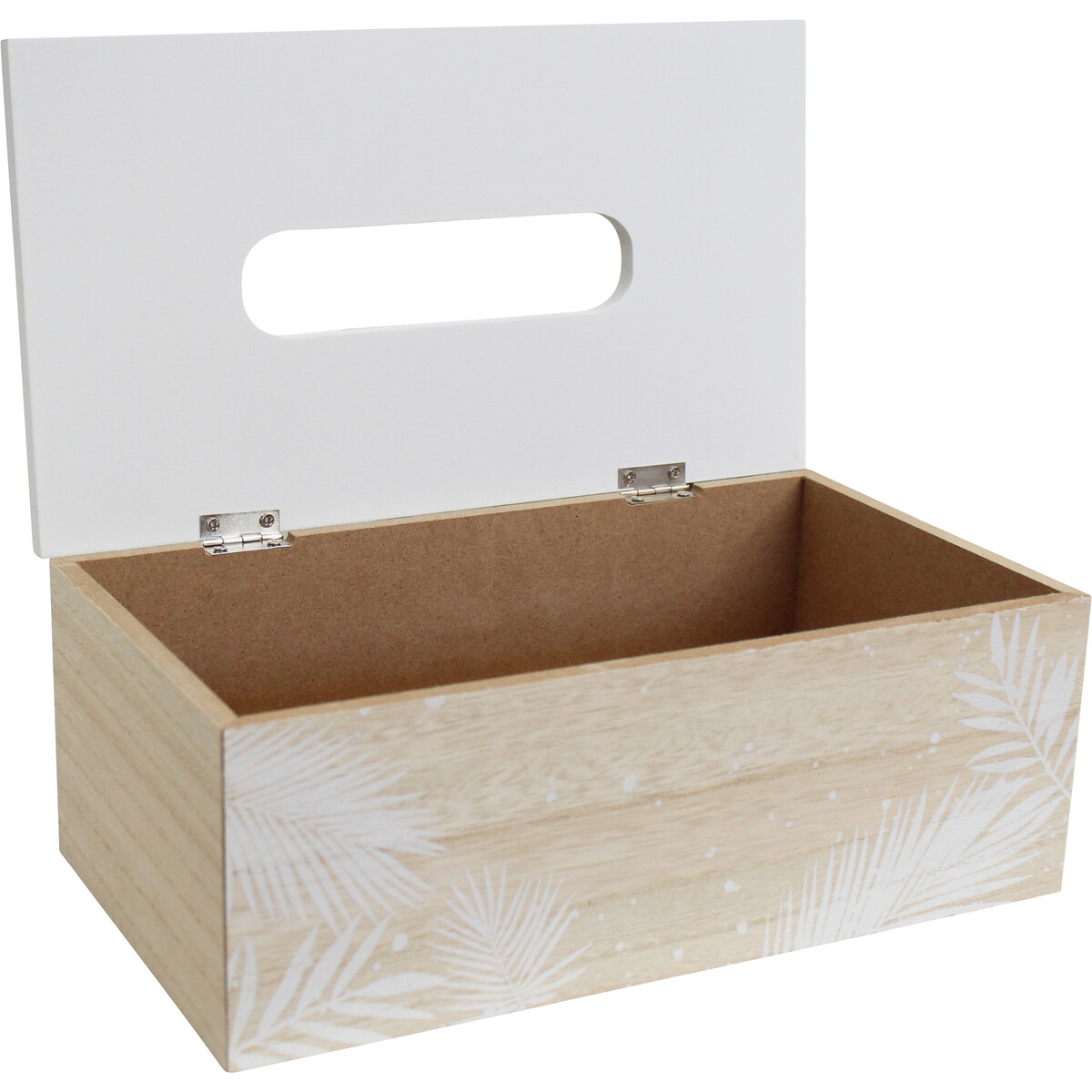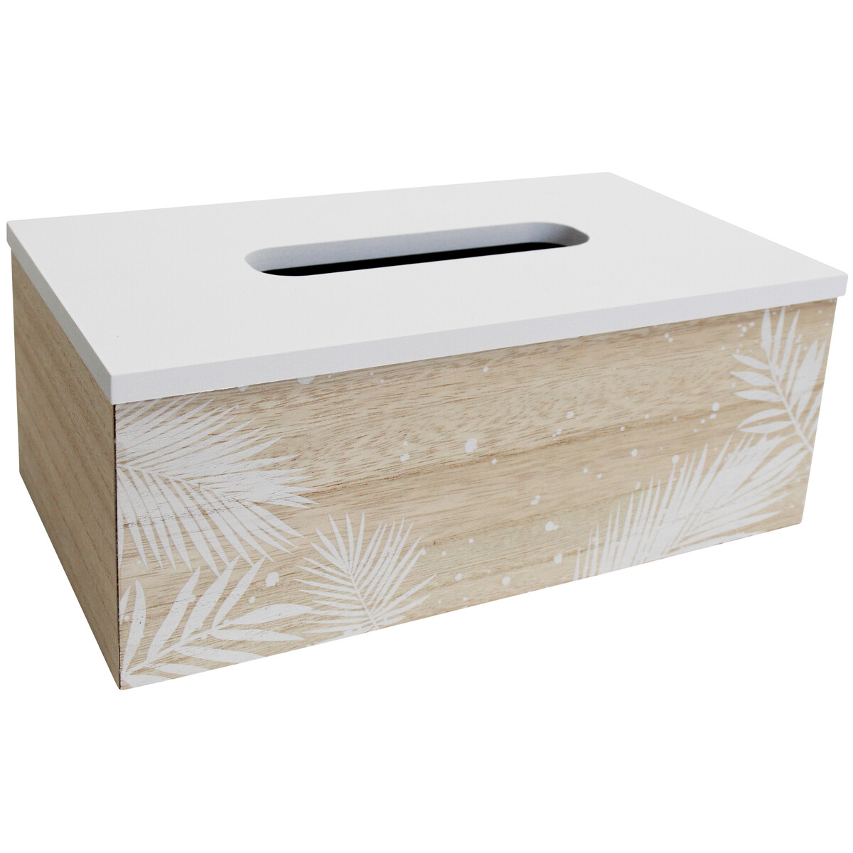 Everything about this Tissue Box Palm is all natural and appealing. It is made through the use of top quality medium density fibreboard material in a rectangular shaped design which has a dimension measuring 25 centimetres in length, 14 centimetres in width and stands at a height which measures 9.5 centimetres. The lid is painted in a pristine white colour while the box itself is left in its natural widen brown colour but with palm decorations.