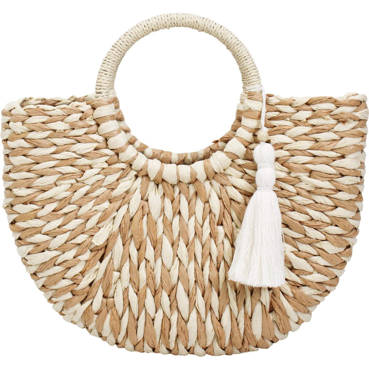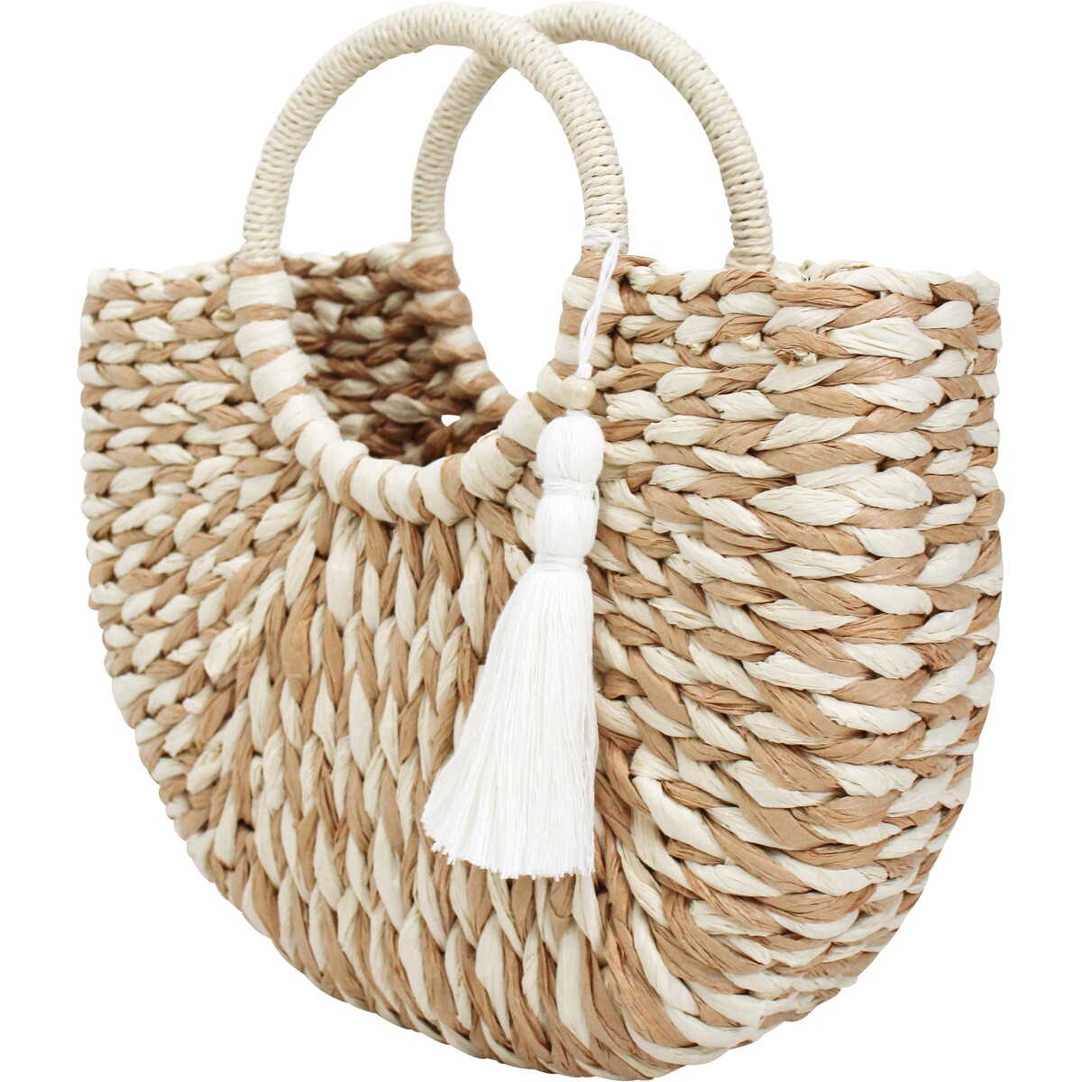 The metal frame gives it a solid shape and on that is the traditional weave of rice paper. The dual tone adds chicness to its already very trendy cool look. The tassel adds more detail and beauty. The shape is curved with a round handle that is also wrapped in rice paper. The tassel in white coordinates with the look of the bag perfectly. Semi-circular in shape the length of the bag is 65 cm and its height is about 30 cm while its width that actually adds to its ability to hold great many things in it comes from its 15 cm width. The rice paper is great for all weathers and all-day outings. The ring like handle settles well on the wrist and being lightweight it does not add to the bulkiness of the weight you might be carrying.