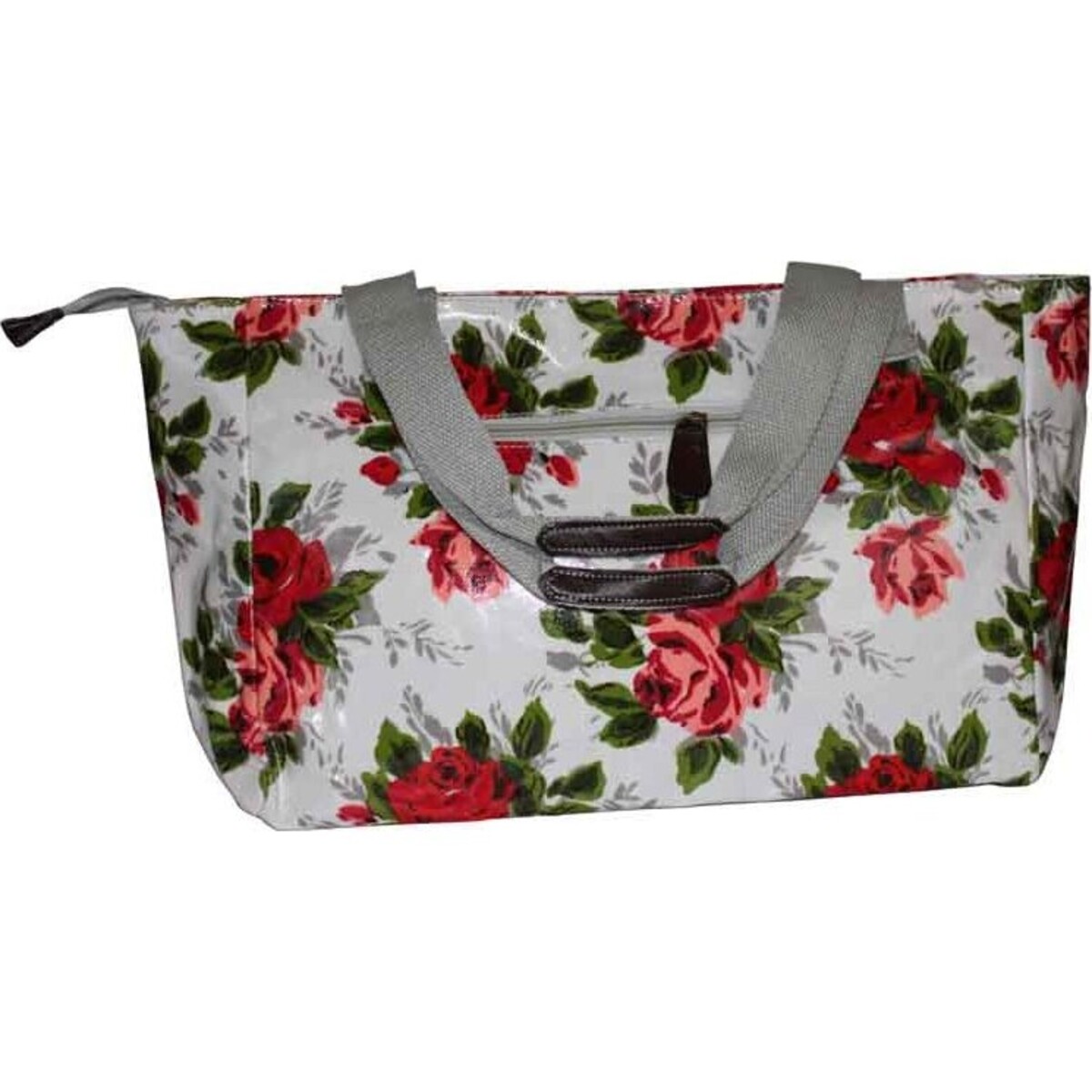 The roomy compartments and multiple options for organization make it a great option for a nappy bag. There is room for all sorts of bottles and toys inside. In this regard, the vinyl material can be easily cleaned in case of a spill. Features of the tote bag include an outside zippered pocket as well as an outside stud pouch. The inside of the tote bag contains two large pockets and an interior zippered pocket. A floral pattern of rose blossoms and leaves on a cream background bedecks this vinyl bag. The colour of the flowers is mostly red. Some of the leaves are grey. It can be carried by means of a beige pair of straps that are lined in black vinyl. The zippers are the same colour.