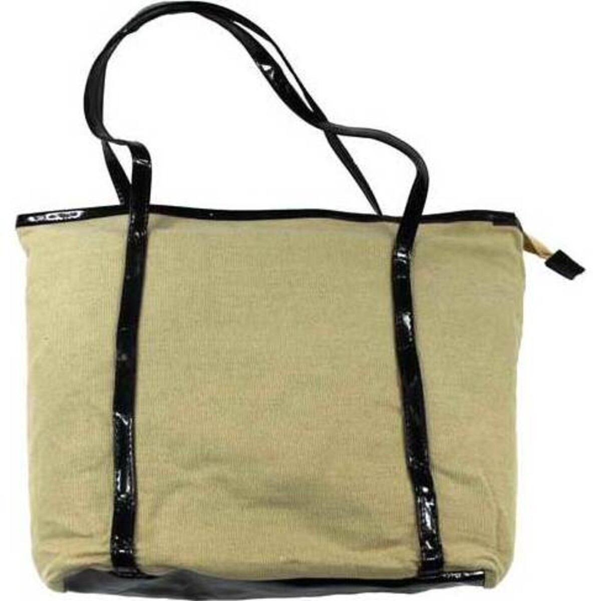 The tote bag features a tan base with two vertical shiny black strips on either side that come together to create two extra-strong handles. An extra strip of black along the top zipper adds extra fabulous detail and also serves to keep the bag securely closed and all your items inside. Its roomy interior allows you to fit everything from baby items to books. Thanks to its neutral colouring, this bag will easily complement any shade and style of beach ensemble you sport.