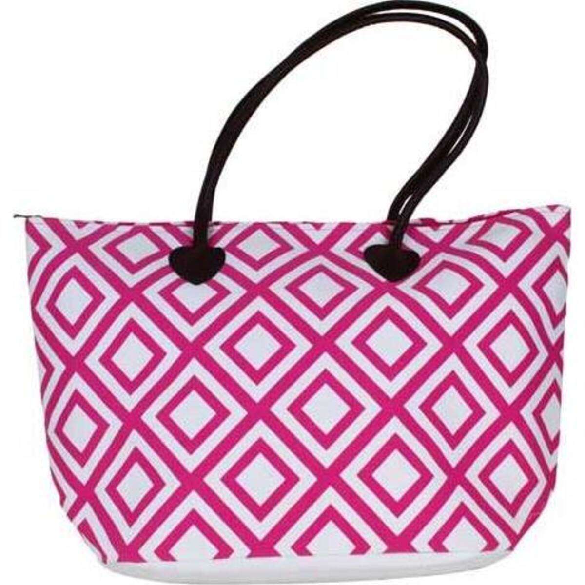 Made from durable polyester canvas this waterproof and highly durable material makes this bag strong yet light. The size is extremely conducive for carrying one's essentials right through the day - be it for a day at the mall, a beach party or simply a day put with kids. The bright pink adds so much feminine charm to the bag as does the classic diamond design that always looks wholesomely classic and very elegant. The bag has an inner lining that does not clash with the colour on the exteriors and basically the bag has one compartment with three tiny pockets within to hold valuables. One of the pockets has a zipper closure and another is meant for the phone. The main closure of the bag is with a magnetic button that simply clicks shut. The handles are in black, are soft and of a length which makes it easy to sling this bag from the shoulder as well as one's arm despite being rather large. Another important feature is the spaciousness of the bag which is so necessary for totes. The seams and the stitches are neatly done giving this bag a very neat finish.
