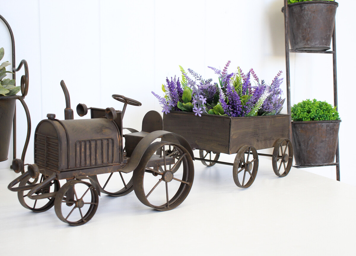 Recently added into our huge, classic collection of Wholesale Garden and Metal Items, this Tractor Trailer Combo is just the perfect piece that will keep your customers satisfied while at the same time, keeping your display looking fresh and trendy. Crafted using high grade metal materials, this product features an intricate and detailed crafting of every component of a tractor including the tires, headlights, steering wheel, etc. It even comes with attachable components such as trailers and wagons which can be used in displaying colourful artificial plants as shown in this sample picture.